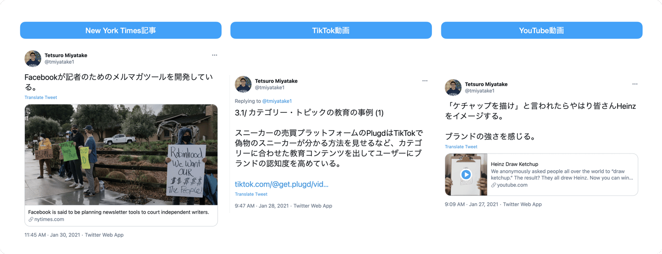 上記スクリーンショットのように、New York Timesの記事はOGP(画像)が見えるが、TikTokだと見えないケースもあったり、YouTubeもURLをクリックしないと動画が見れない。