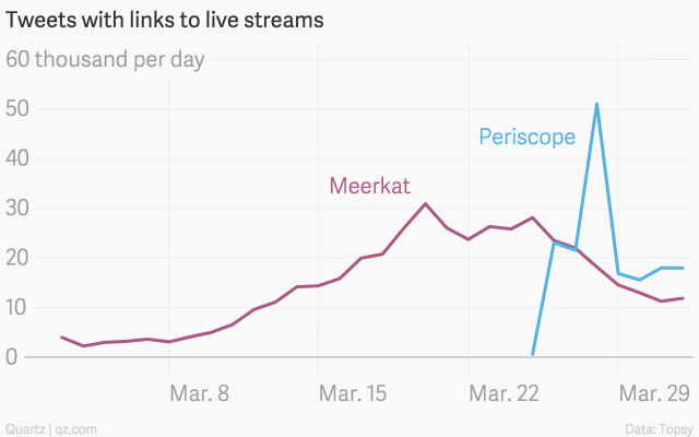 TwitterがMeerkatとの関係性を切った理由は明確。Meerkのローンチ直前にTwitterはMeerkatの競合サービスのPeriscopeを$100Mほどで買収していた。関係性を切って、Periscopeがローンチした際にTwitter上でのMeerkatとPeriscopeへの配信URL数を見ると、差が出たのがわかる。