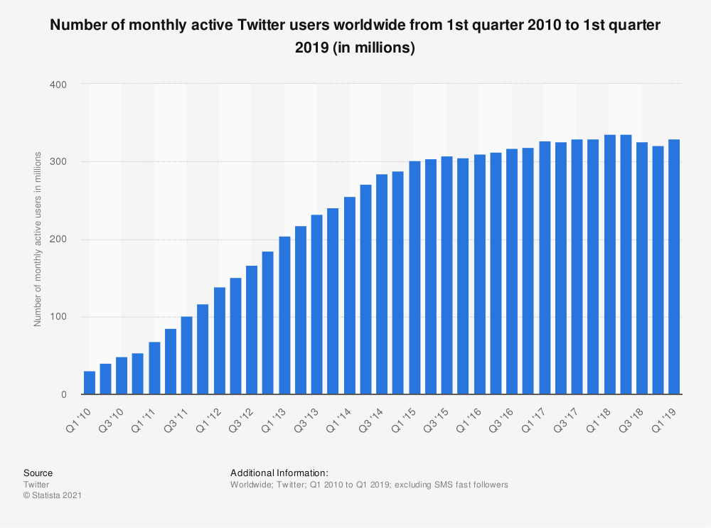 Twitterのエンゲージメントへのフォーカス実はTwitterのMAUはここ数年フラットになっているが、DAUが伸びている。まずMAUは2017年から3.2億〜3.5億ユーザーのままで増えていない。