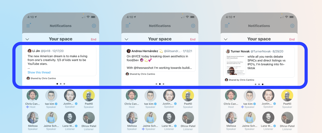 Clubhouseとの機能の違いまず、最も分かりやすい違いはTwitter Spacesだと部屋のスピーカー・モデレーターがツイートを表示できること。ツイートがTwitter Spaces内のUIで現れ、それを他のスピーカーやリスナーが読んで、それについて会話ができるようになっている。