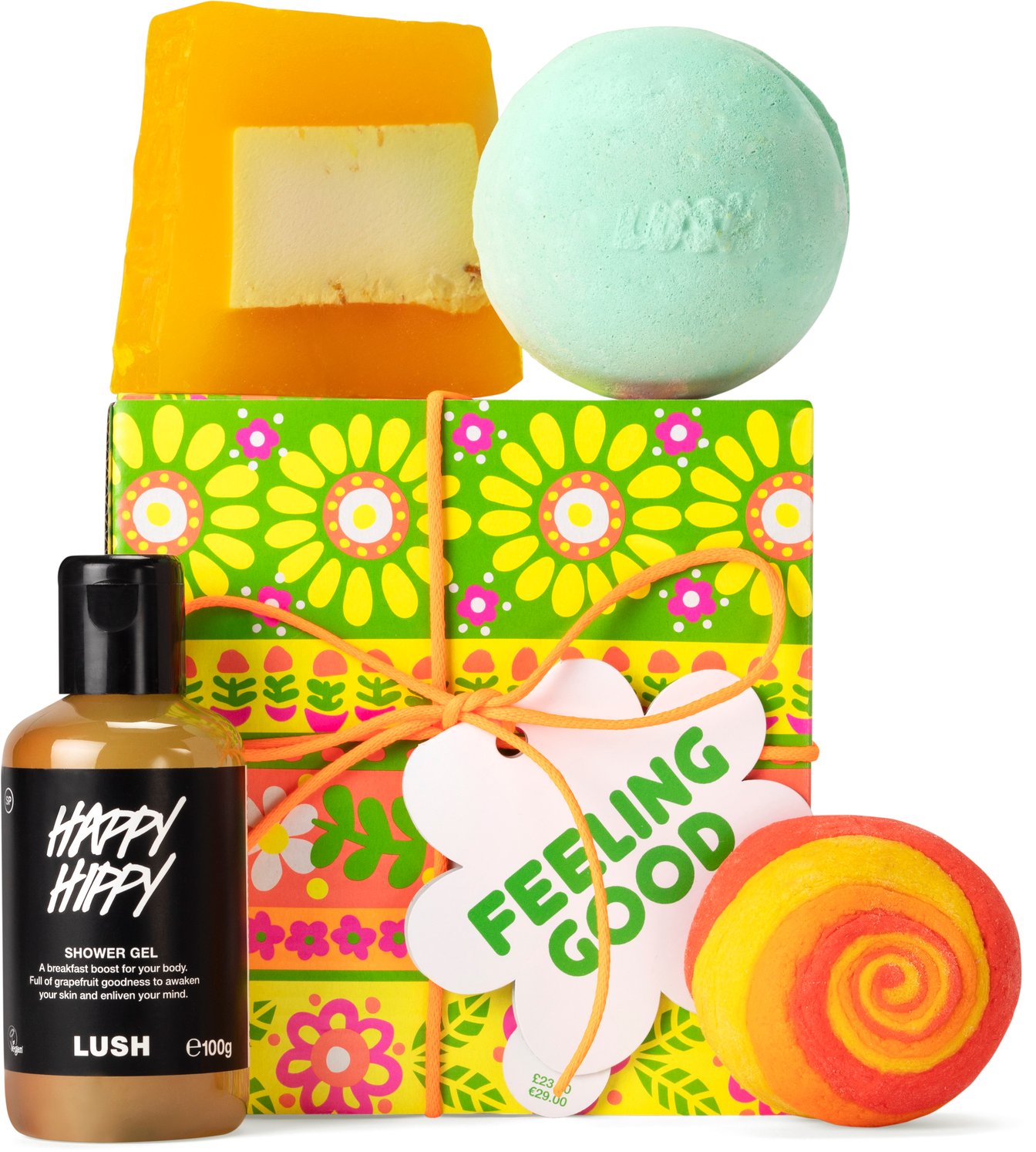 カラフルな色使いが楽しい「フィーリング グッド」(税込4,020円)は、ジューシーな香りがテンションを上げてくれるギフトです。しぼりたてのフルーツのようなジューシーな香りと、お肌へ良い働きをもたらしてくれるアイテムがイン。