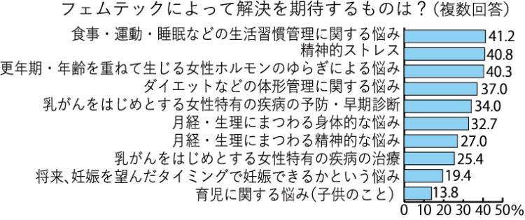 フェムテックで解決を期待する悩みは、「生活習慣管理に関する悩み」「精神的ストレス」「女性ホルモンのゆらぎによる悩み」が40%を超えた。健康課題が解決された場合には、仕事のパフォーマンスは平均して「現状より41.3%上がる」となった。