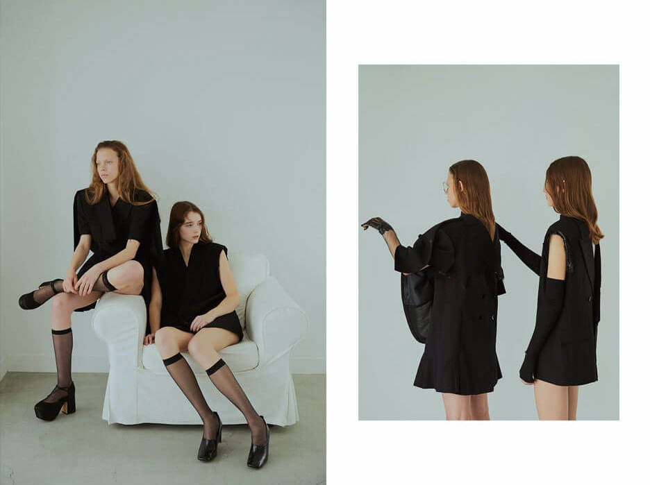 left - coat by KISHIDAMIKI, headdress by MIU MIU,right - vintage coat by LITMUS, headdress by PALOMA WOOL,both wearing - socks by NIKE, shoes stylist's own
