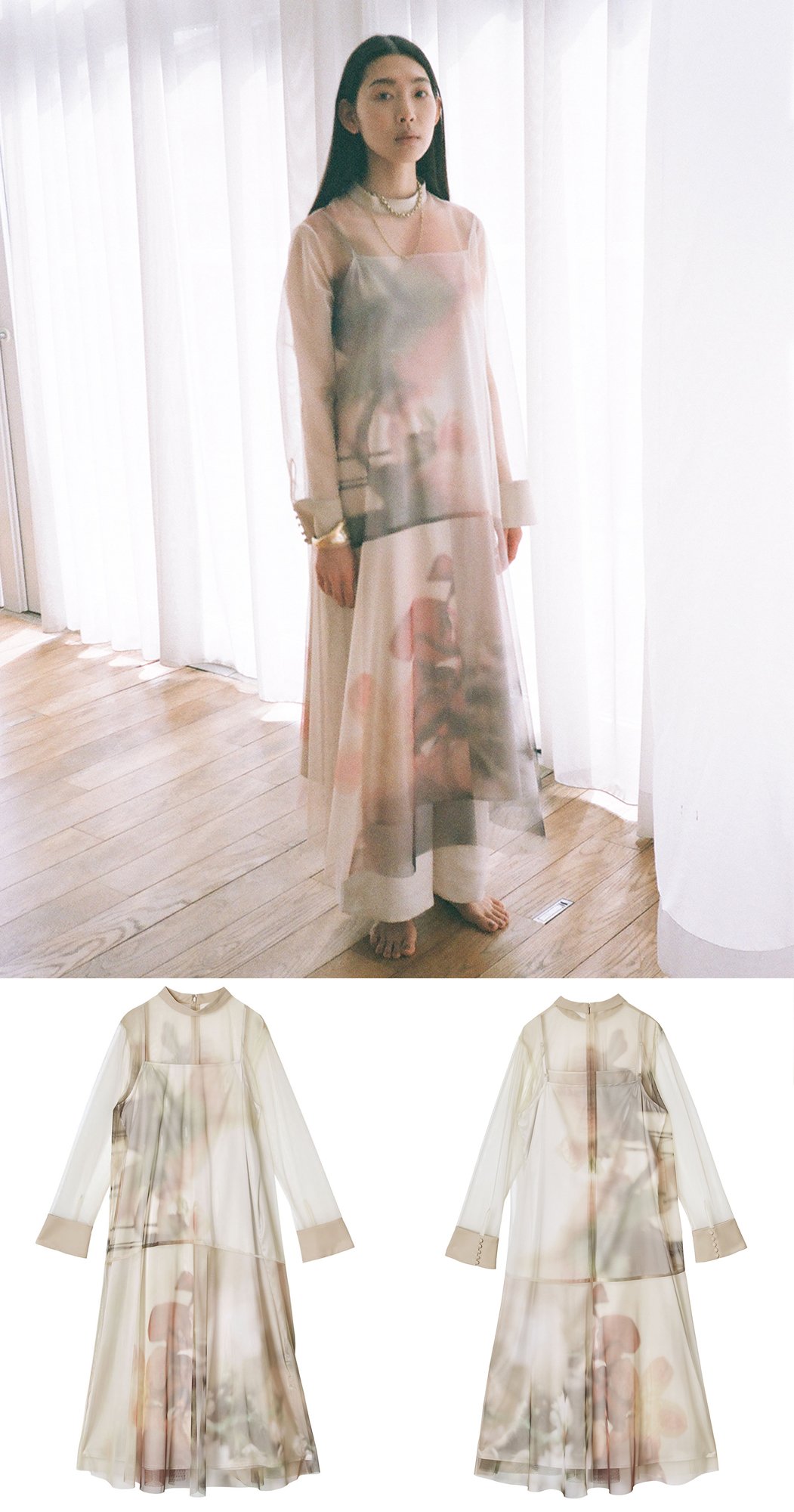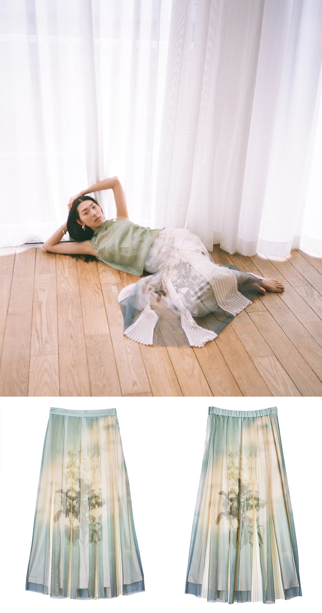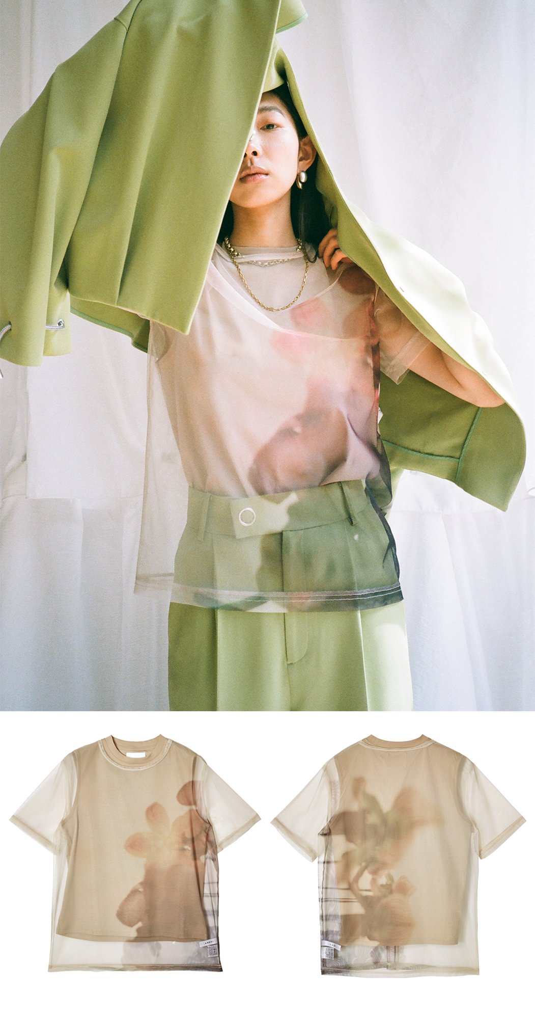 今回のコラボでは永瀬の作品をチュール素材にプリントしたアイテムが登場。インナーにシルケット加工を施したカットソー素材のタンクトップが付いたレイヤードTシャツ(1万3,000円+税)、インナーに肌心地の良いカットソー素材のTシャツが付いたロングTシャツ(1万5,000円+税)、体型を拾わないサイズ感でデイリーにもオケージョンにも使えるワンピース(2万4,000円+税)、細かいプリーツを施したシフォンがプリントの隙間から見え隠れするスカート(2万円+税)、左右で異なる作品をプリントしギャザーを寄せたデザインのバッグ(1万円+税)、両面に異なる作品をプリントした2枚仕立てのスカーフ(7,000円+税)の6型がラインアップする。「無邪気なエネルギーで好奇心を解き放っている。」そんな思いを込めた永瀬の作品の中から花の写真をメインに選定し、世界観やニュアンスを最大限に引き出せるよう2枚の写真を組み合わせた。繊細な色彩や女性らしい抜け感を素材やディテールで表現している。