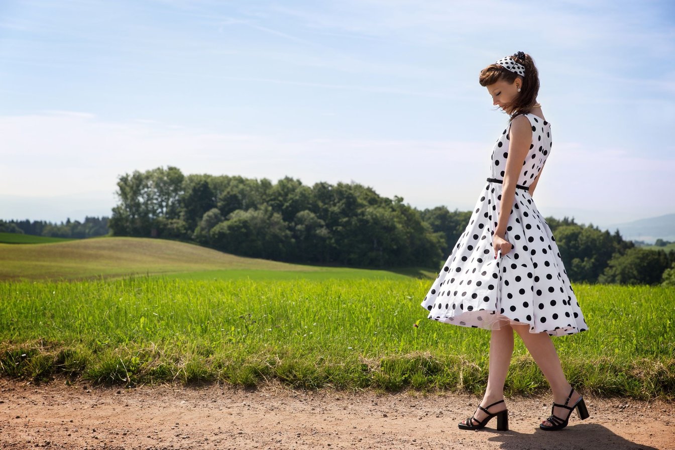 ニュー・ルックはChristian Diorが1947年に打ち出したファッションスタイル。丸みのある肩と胸、ウエストを絞ったトップスにふんわりとしたAラインシルエットのスカートが特徴。この時代のファッションは特にシルエットに重きを置いていて、スカートの中にペチコートを入れて膨らませていました。グローブ、ハンドバッグなどのアイテムが人気で、上品なお嬢様スタイルが主流。1950年代は、それまでモノクロだった日本の雑誌にも色が付き、ファッション業界も活気付くなど、次第に豊かな生活を求める気持ちがファッションにも反映され始めたタイミング。華やかなニュー・ルックがトレンドになるのも頷けますね。当時、世界的な人気を集めたオードリー・ヘップバーンがレディライクなニュー・ルックを魅力的に着こなしていたこともあり、日本でも大流行したと言われています。