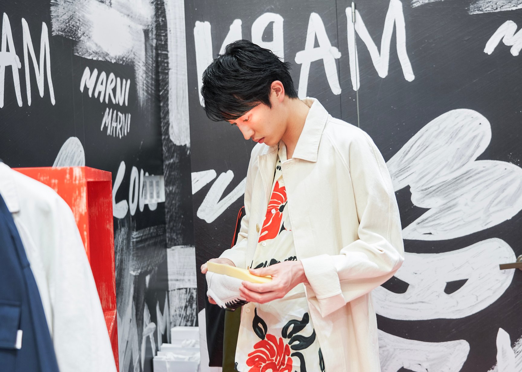 ポップアップではメンズ、ウィメンズともに、デジタルショーで発表された2021年春夏コレクションをラインナップ。このほか、ハンドペイントを施したトランクバッグやTシャツ、ウォレットなど日本限定アイテムを週替わりで展開する。4月1日からTシャツ(3万8000円)、バイカラー ナイロントートバッグ(3万5000円)、8日からラフィアバッグ(9万5000円)、15日から二つ折り財布(4万9000円/いずれも税別)を発売。アイテムは3月31日までパルコのオンラインストアで先行受注を受け付けているほか、4月1日からマルニの公式LINE ECサイトでも取り扱う。期間中、税別5万円以上の購入者には数量限定でノベルティを配布する。