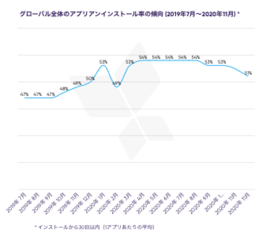 AppsFlyerのデータによると、世界でインストールされているアプリの約半数が、ダウンロードされてから30日以内にアンインストールされていることがわかった。2020年1月と2020年3月以降で、インストール後30日以内のアンインストール率が急上昇している。1月は新年・長期休暇明けという点で新しいアクティベーションが起こったことと、3月以降は在宅時間の増加や、モバイル接触時間の増加が発生したことが、アンインストール率の上昇と関連づけられるという。