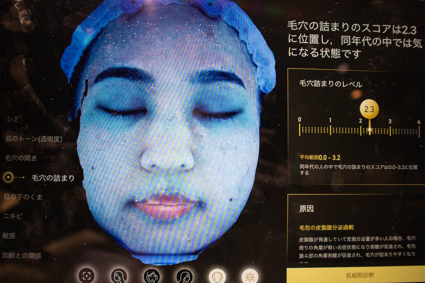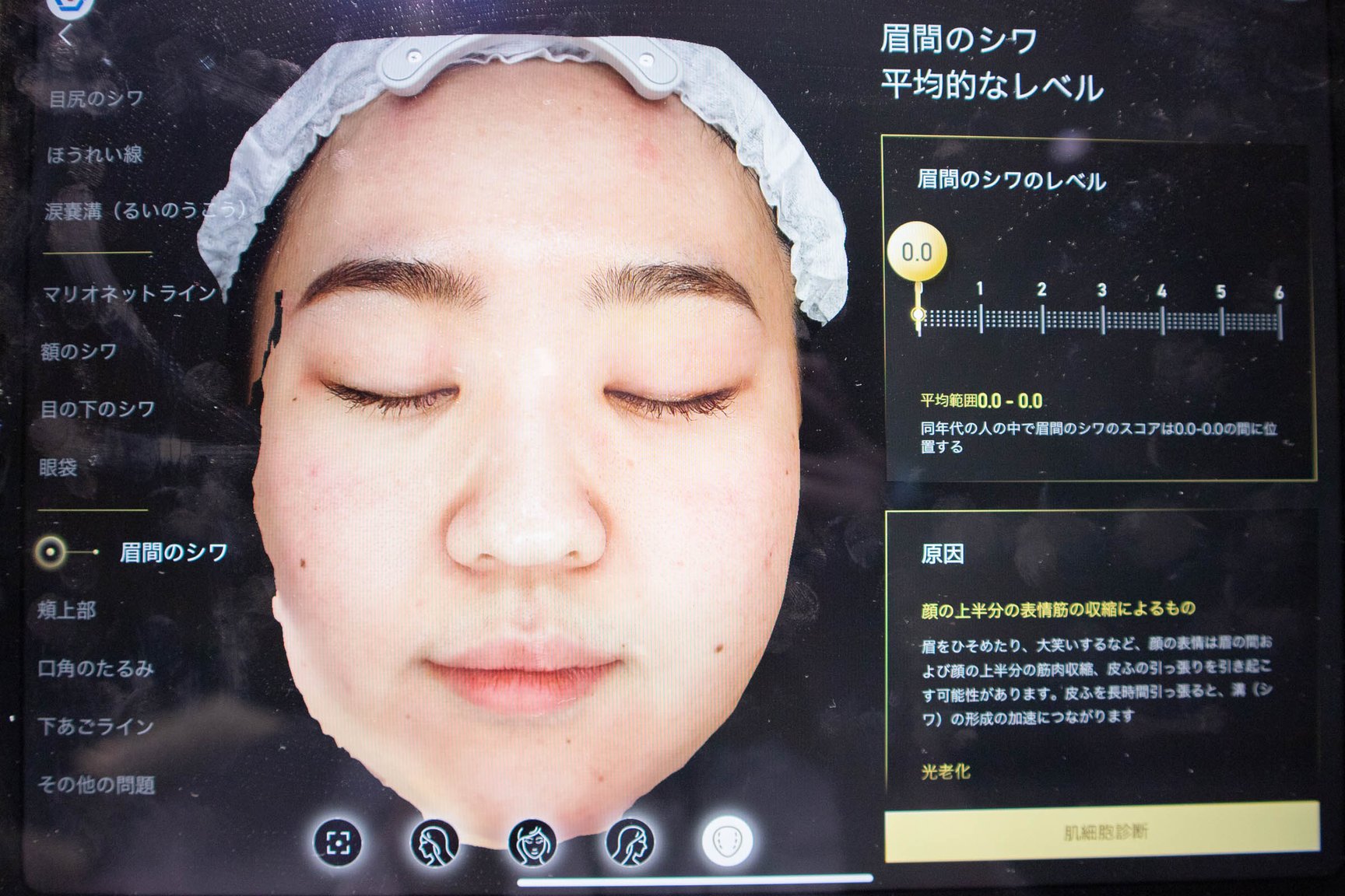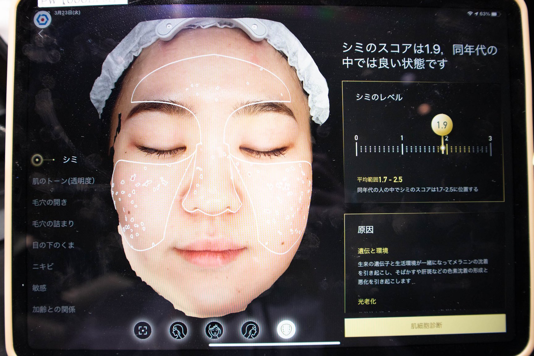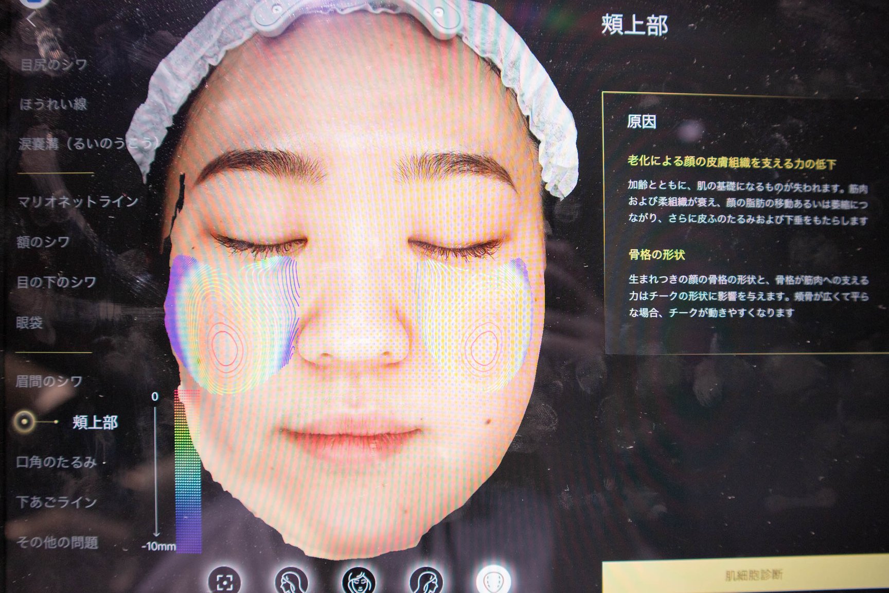 美容機器と美容液を組み合わせたエフェクティムの肝となる3D肌解析機は、中国とアメリカに拠点を置き、顔認識およびバーチャルトライオンサービスを提供している企業メイツ(Meitu)と共同開発。スキャニングポッドと呼ばれる小部屋型の機械の中で顔の正面と側面を撮影すると、肌状態をほうれい線やシワ、毛穴の開きといった18項目を、3D画像化した顔写真とともに確認できる。資生堂独自のアルゴリズムにより、解析結果から肌のダメージ具合に最適なトリートメントメニューをAIが考案。ヤーマンの技術を活用した美顔器に、パーソナライズしたメニューをその場でインストールする。AIによるパーソナライズメニューの総数は非開示としたものの、様々な肌状態に対応可能だという。