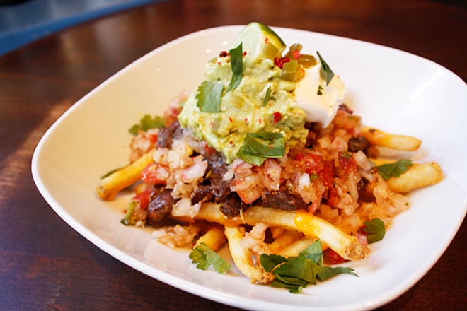 人気メニュー、西海岸のソウルフード「カルネアサダフライ」(ハーフ サイズ1,000円、フルサイズ 1,600円)。フライドポテトに牛肉と、アボカドクリームやチーズを乗せたお酒が進む味わいだ。