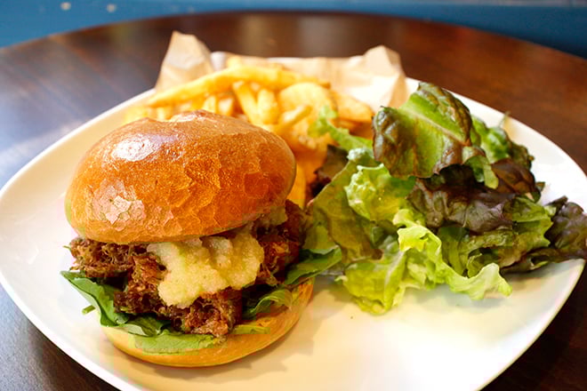 ハードサイダーに合うパブフードも充実。こちらはランチでも人気の「ベーグルサンドウィッチ」(800円、セット1,000円)。24時間煮込んだ豚肉にりんごソースを合わせた「プルドポーク」など3種から選べる。