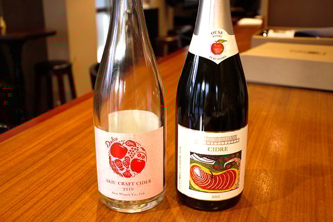 宮城の秋保ワイナリーが手掛ける「秋保クラフトサイダー」(左)と、福島県のふくしま逢瀬ワイナリーの「サイダー2016」。サイダーはビールと異なりグルテンフリー、プリン体フリーである点も注目されている。