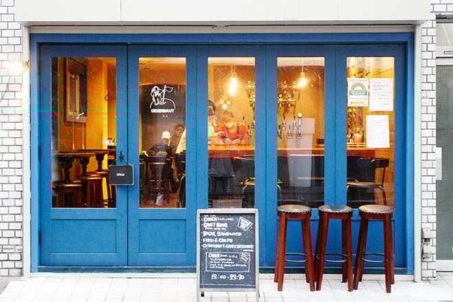 おしゃれなブルーのファサードが目を惹く約16坪の店舗は、天候が良い日にはフルオープンに。開放的な空間にはイギリス製のハンドポンプのタップが並び、カウンター席からサイダーを注ぐ様子が眺められる。