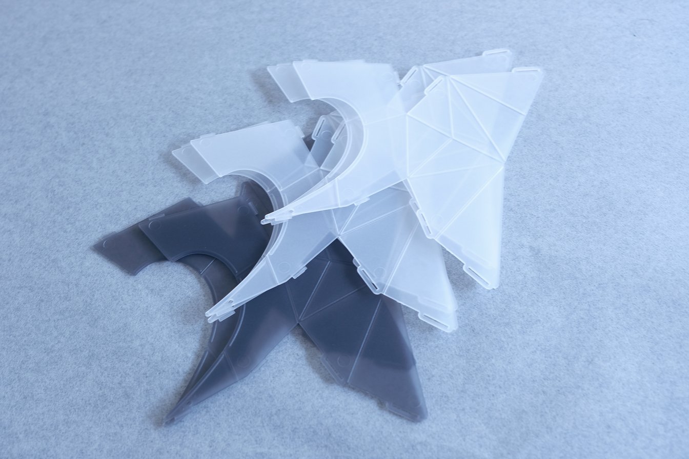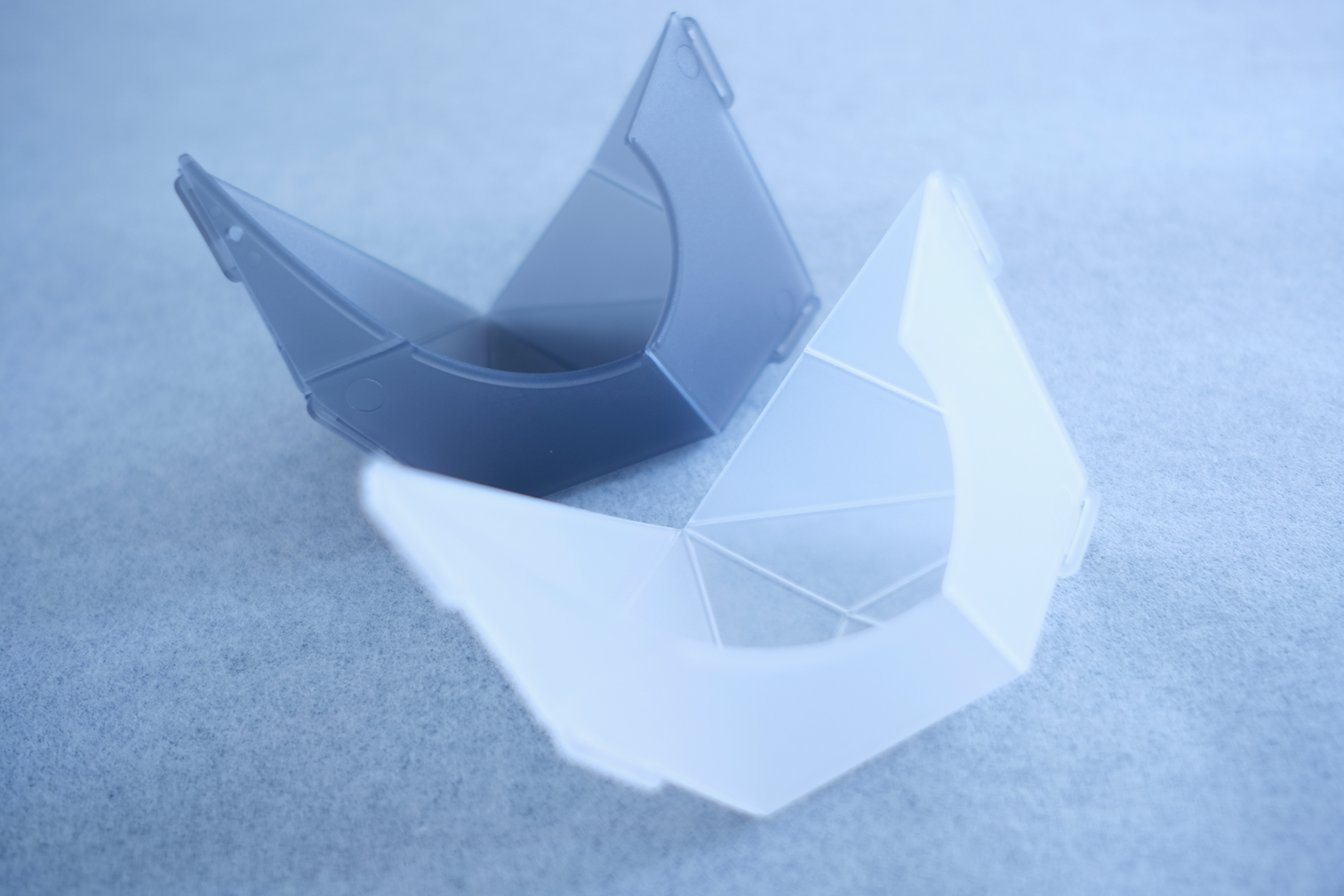 「KIKIMIMI」は、聴く意識を高め、耳の感覚を研ぎ澄ますことを目的としたアクセサリー。ポリプロピレン樹脂でできたシートを折り紙のように折って留めることで組み立てるため、軽量で持ち運びやすく、手軽に携帯しやすい形状となっている。