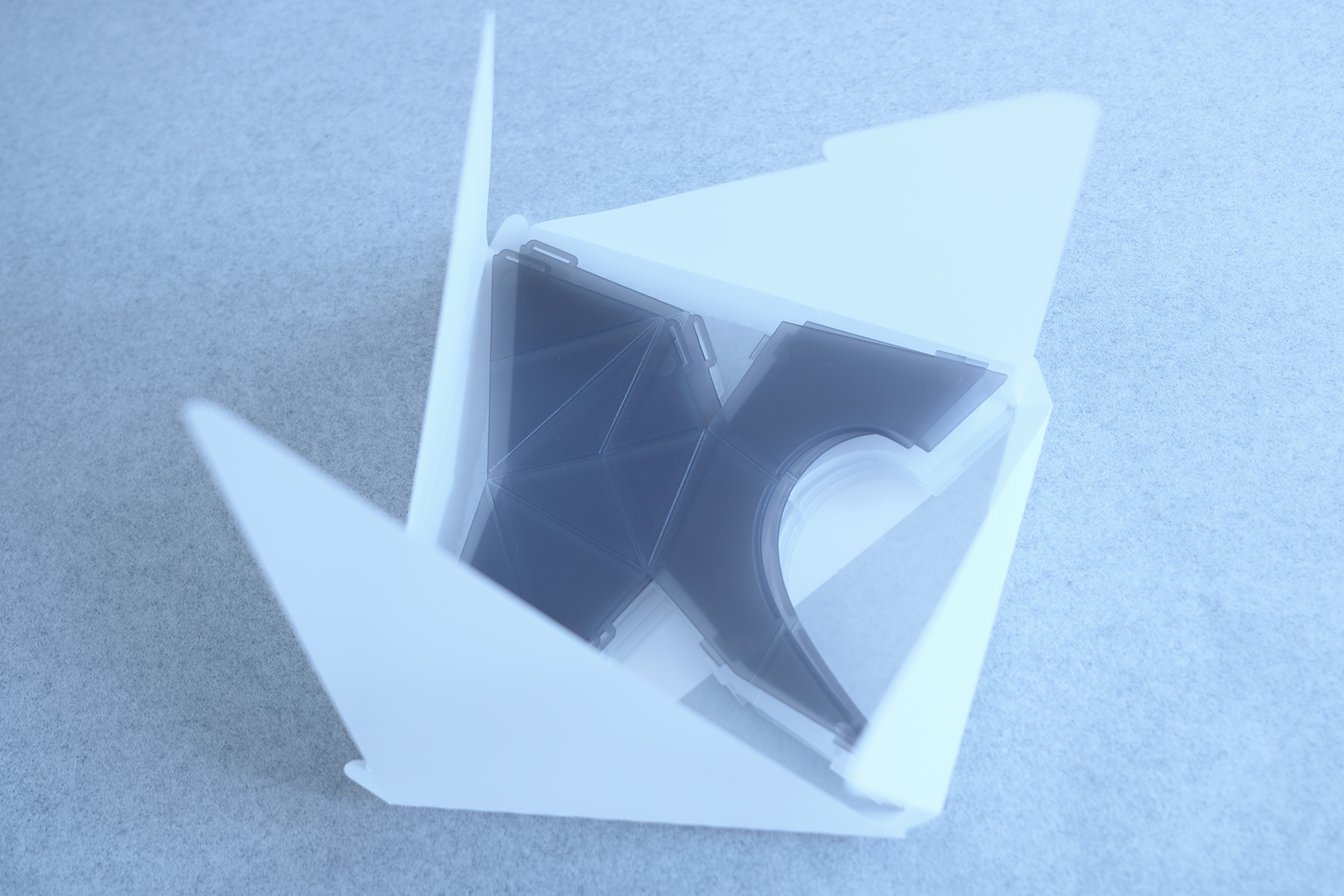 着用すると、両手で耳を覆ったような形となることから、特に顔の正面からの音にフォーカスされ、何も付けていないときよりも話し声や音楽などが聞き取りやすくなることが特徴だ(※1)。さらに、組み立てたときのデザイン形状には平行面がないため、フラッターエコーと呼ばる音響障害の発生を抑えられる。よって、いわゆるカクテルパーティ効果(※2)に近い聞こえがもたらされることが期待できる。