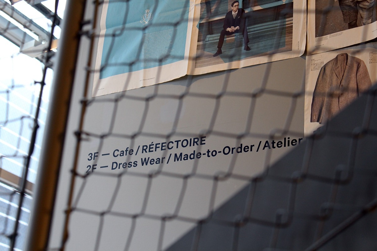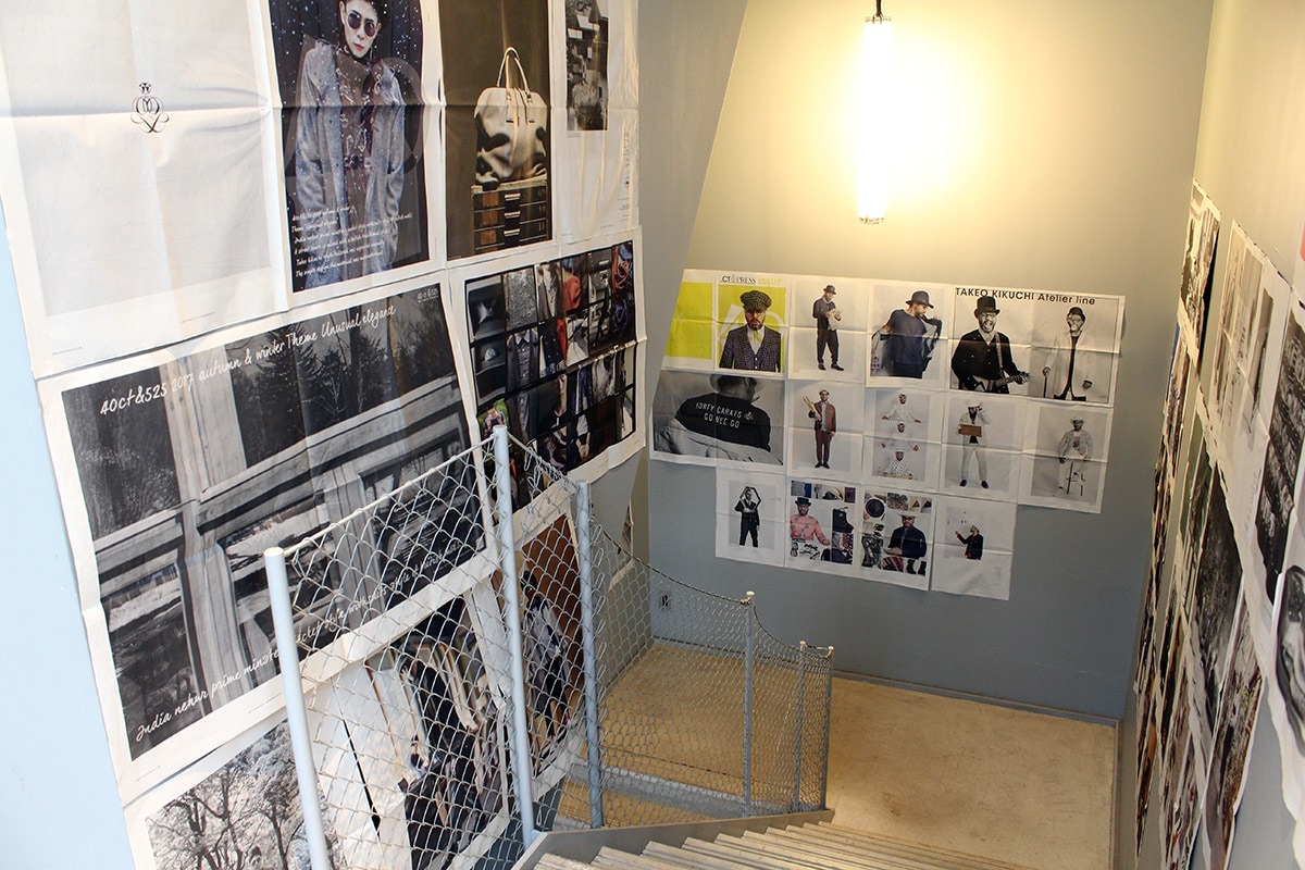 1Fから3Fまでの階段には、これまで瀬尾氏が手掛けたTAKEO KIKUCHIのタブロイドを展示。行きでエレベーターを使った人は、必ず階段を使って会場を後にするべし。