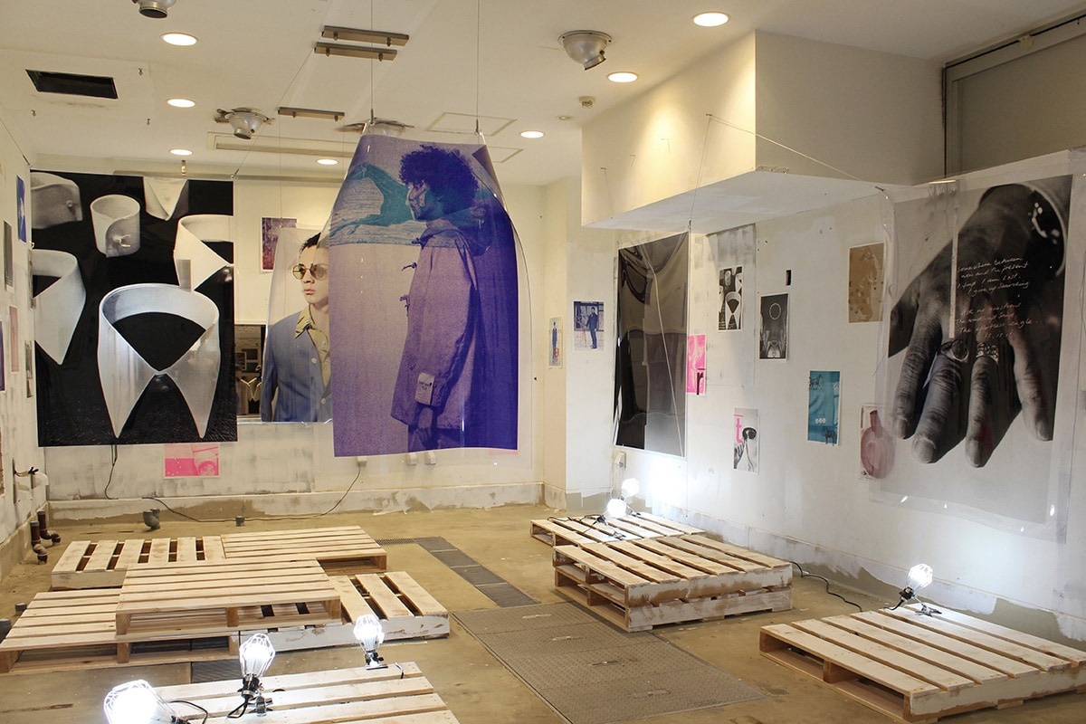 通常はシーズン限りで使われなくなってしまうファッション写真にアートワークを施し、新しい作品として蘇らせている。天井から吊り下げられた大型作品は、厚手のビニール素材にイメージをプリントしたもの。こちらも瀬尾氏にとって初めての試みだ。