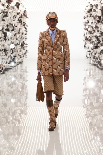 コレクション映像のメインとなる舞台は、両側の壁に無数のライトやカメラが設置されたランウェイ。リック・ロス(Rick Ross)の「Green Gucci Suit」や、bhad bhabie feat. lil yachtyの「Gucci Flip Flops」、James Miller & DMC Mansurの「Gucci On My Bag」など、曲名に「グッチ」が入った楽曲をBGMにモデルたちがウォーキングした。