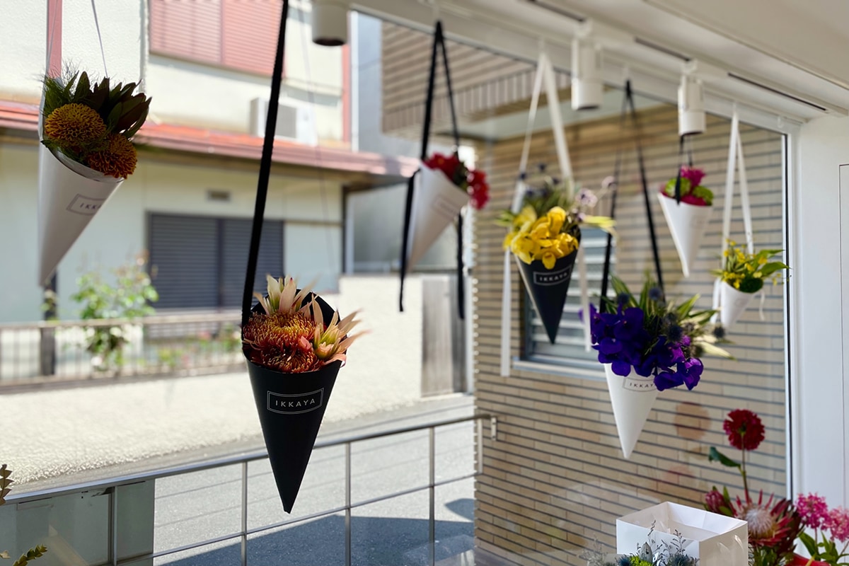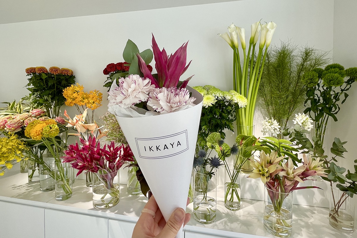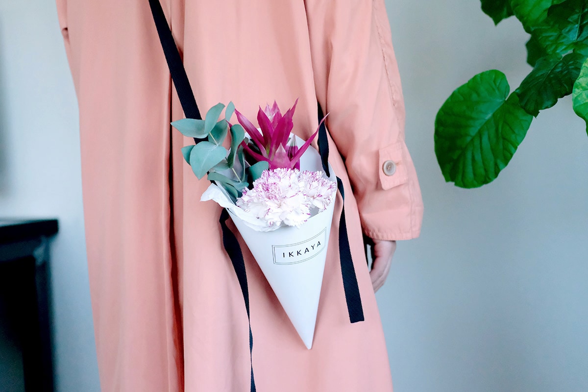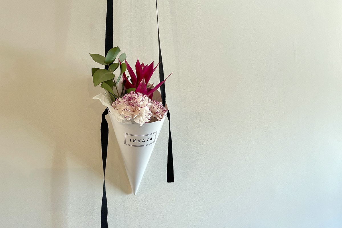 IKKAYA OMOTESANDO最大の特徴とも言えるのが「コーンブーケ」。花束のパッケージ素材として一般的なセロファンを使わずに、ハリのある厚紙で花のまわりをくるりと覆っている。その名の通りアイスクリームのコーンのような姿が可愛らしい。