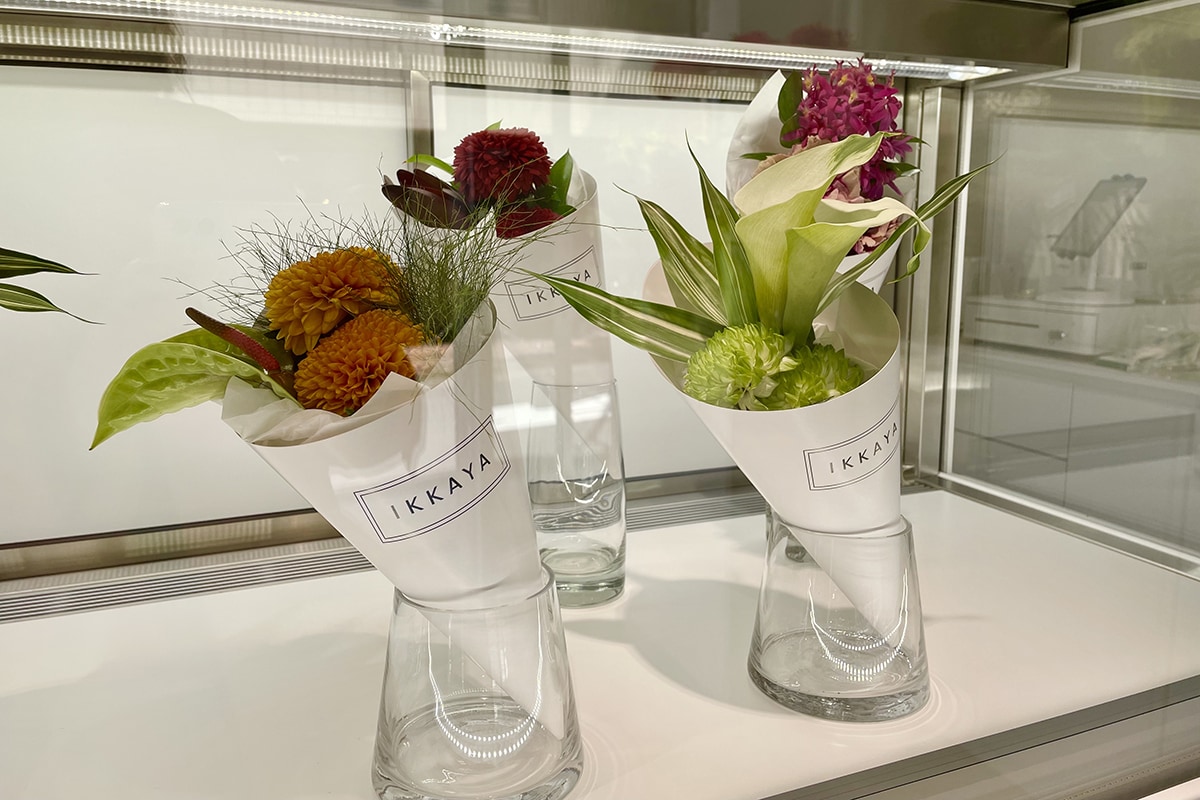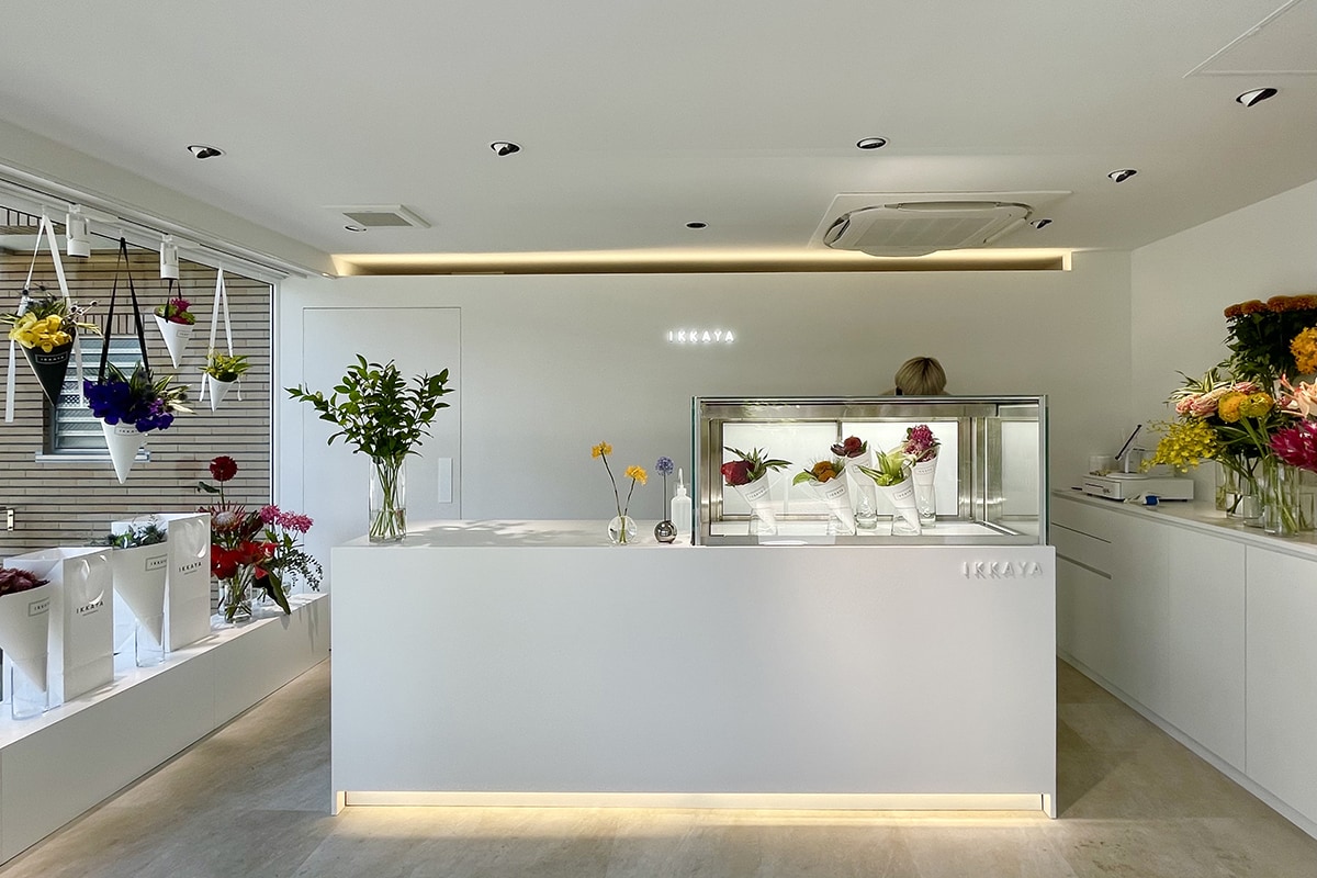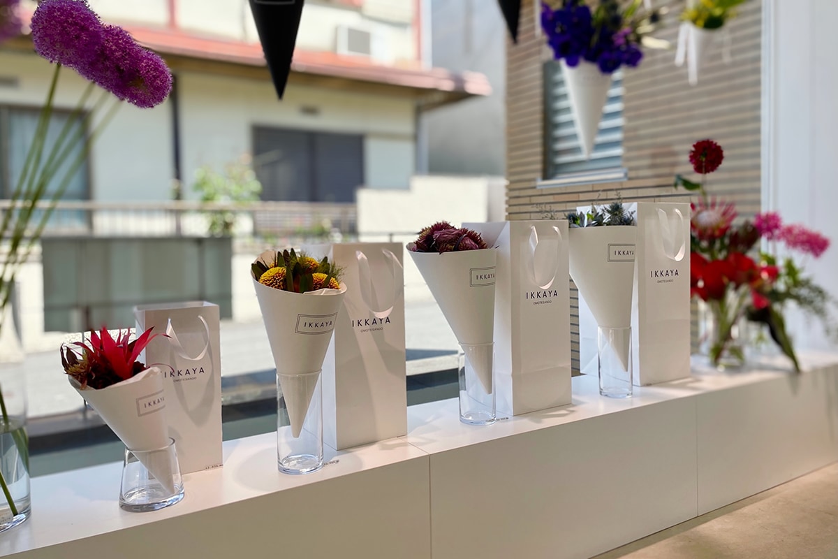 ここまでさらりと紹介してきたが、“店づくり”に携わったのはオーナー・三嶋氏が絶大な信頼を寄せるプロフェッショナルたち。ロゴデザインはエルメス表参道のビジュアルやライフスタイルショップCIBONEとのコラボレーションが話題のアーティスト・YOSHIROTTEN氏、スタッフのユニフォームはデザイナー武藤亨氏率いるJens(イェンス)、店舗内装はADDICTの中西弘一氏といった面々が集結した。シンプルでありながら確かな個性を放つIKKAYA OMOTESANDOは、そんな彼らの感性と経験に裏打ちされているのだ。魅力的なフラワーショップの多い表参道&原宿にあって、新鮮さに溢れたIKKAYA OMOTESANDO。ここを目的地に、この街へ通う人が増えそうな予感がする。