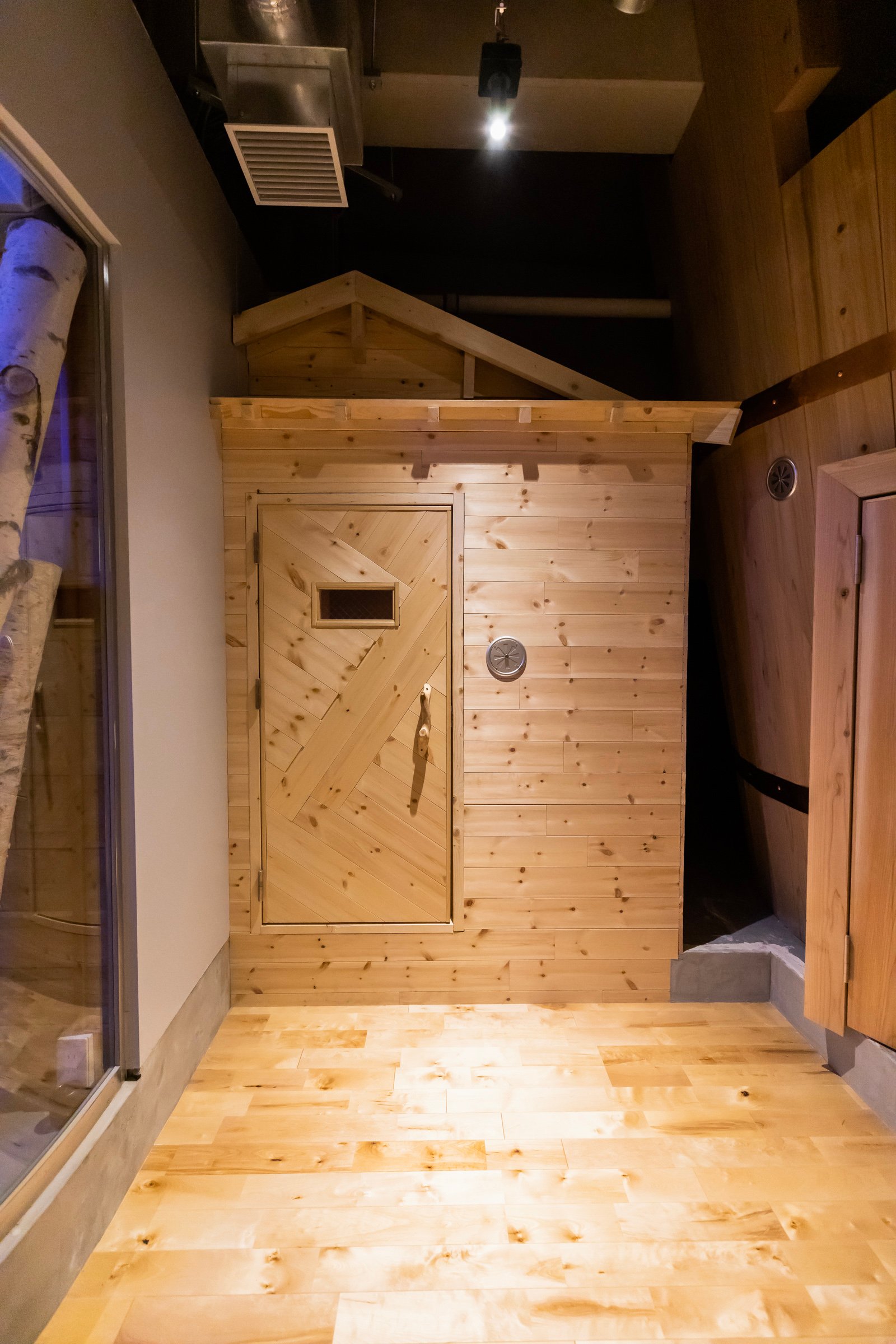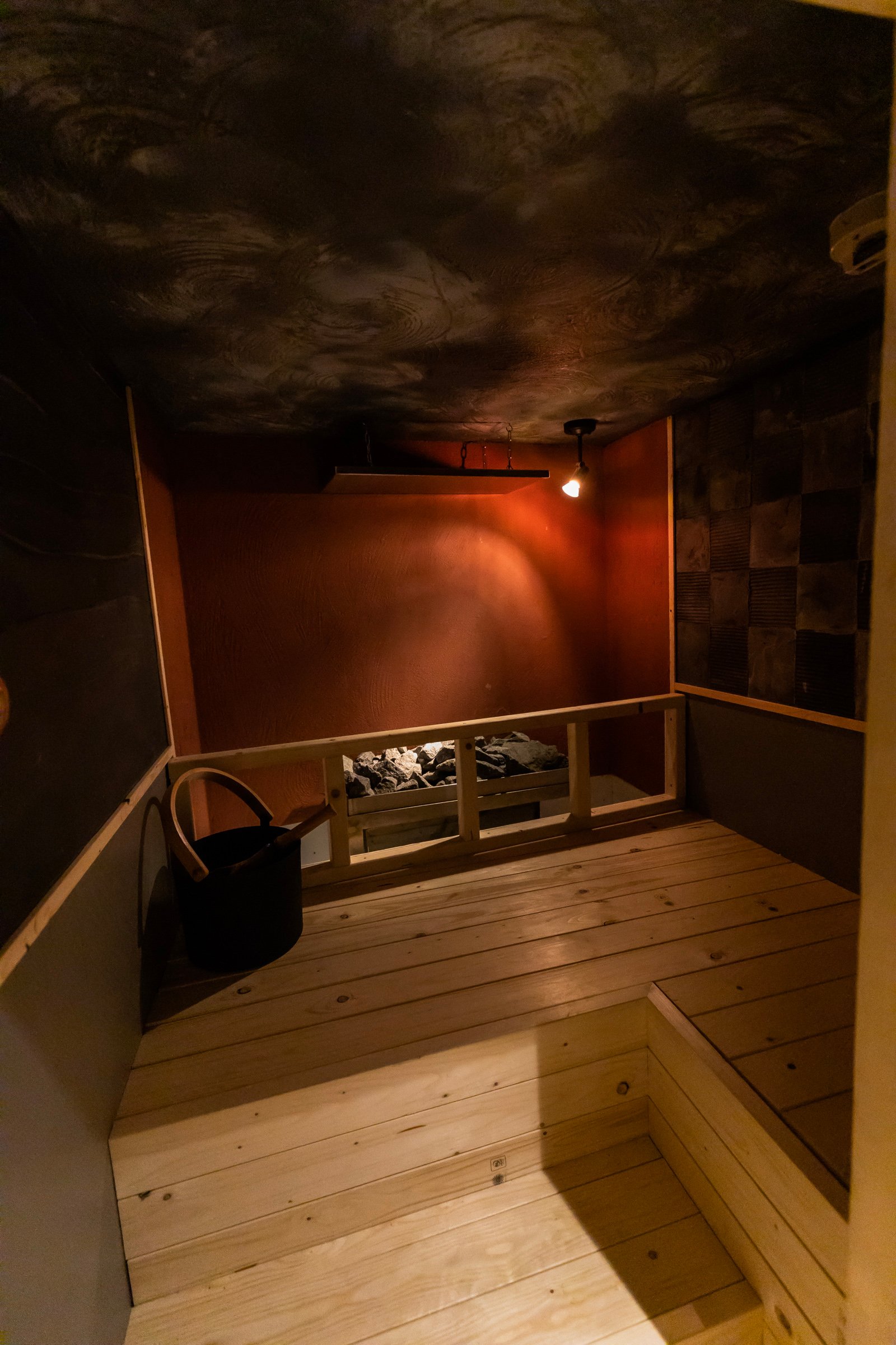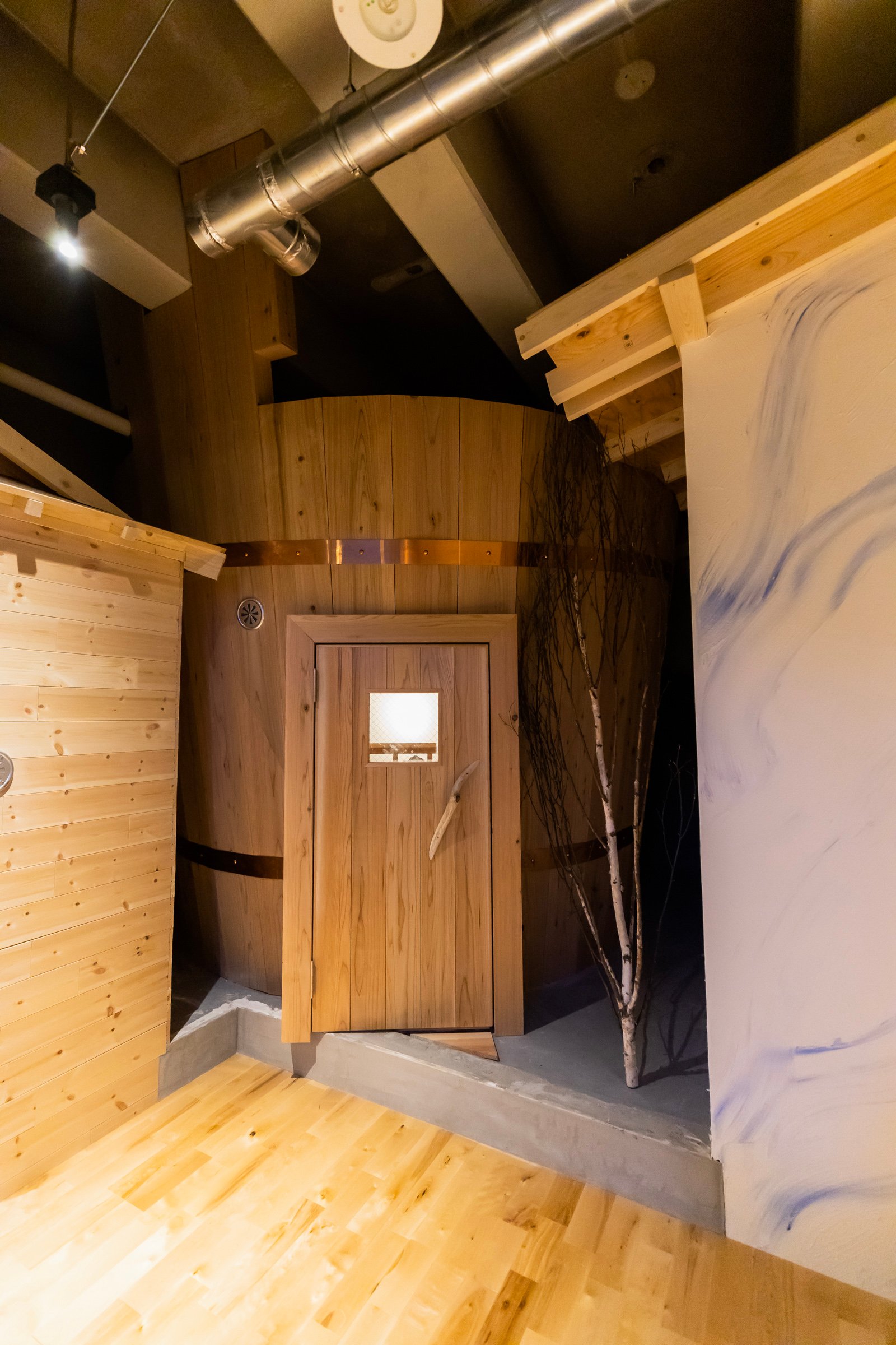 サウナ室は男性3部屋、女性2部屋の計5部屋で構成。すべて室内温度は約70度前後で、熱や蒸気を感じやすいように天井を日本人の平均身長から約20cm程度の高さに設定した。男性エリアではフィンランドサウナと、桶の形をした桶サウナ、日本の蒸し風呂を現代風に表現して正座で入浴する一人用サウナを展開する。