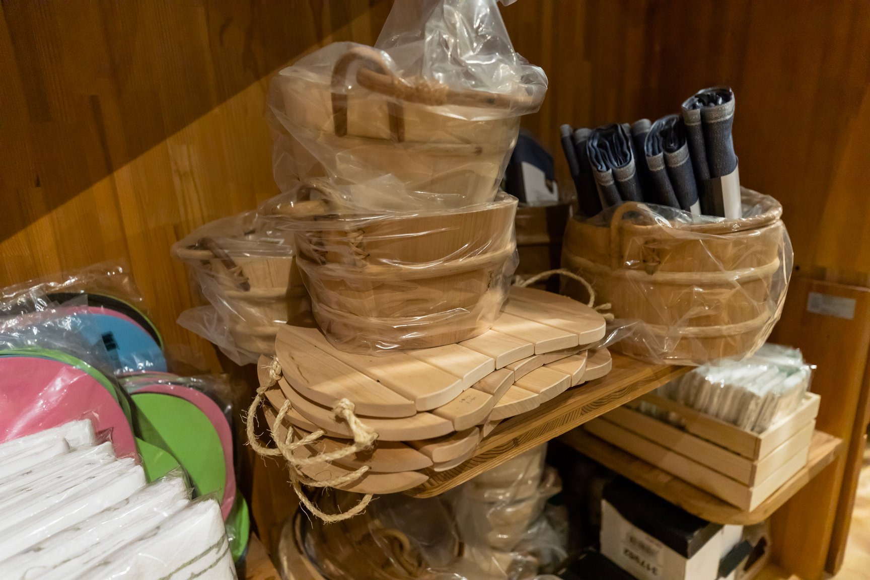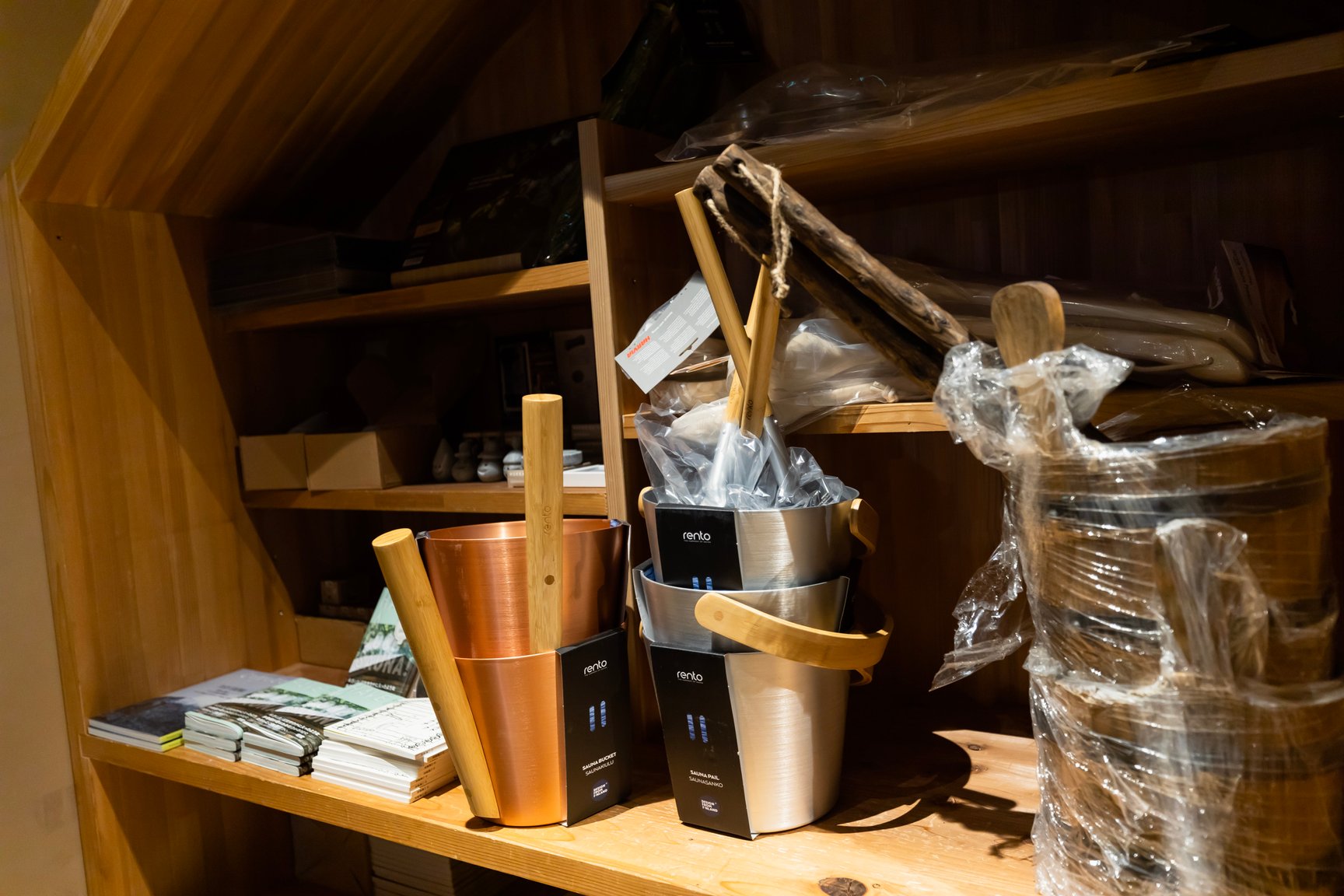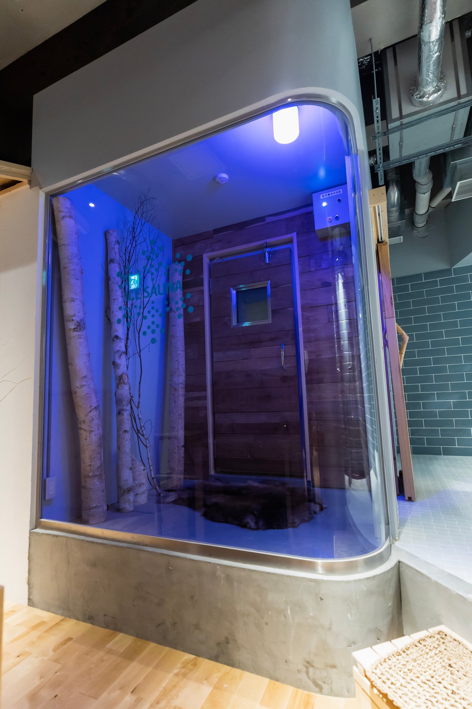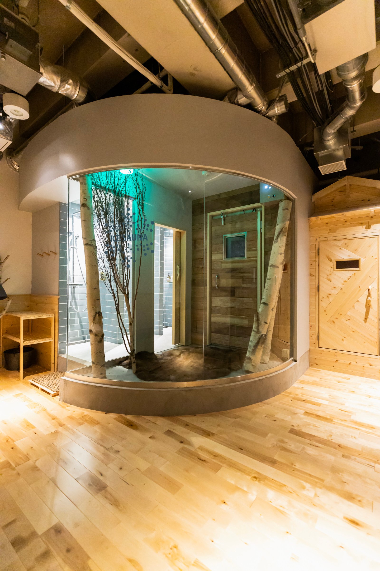 サウナ室は男性3部屋、女性2部屋の計5部屋で構成。すべて室内温度は約70度前後で、熱や蒸気を感じやすいように天井を日本人の平均身長から約20cm程度の高さに設定した。男性エリアではフィンランドサウナと、桶の形をした桶サウナ、日本の蒸し風呂を現代風に表現して正座で入浴する一人用サウナを展開する。