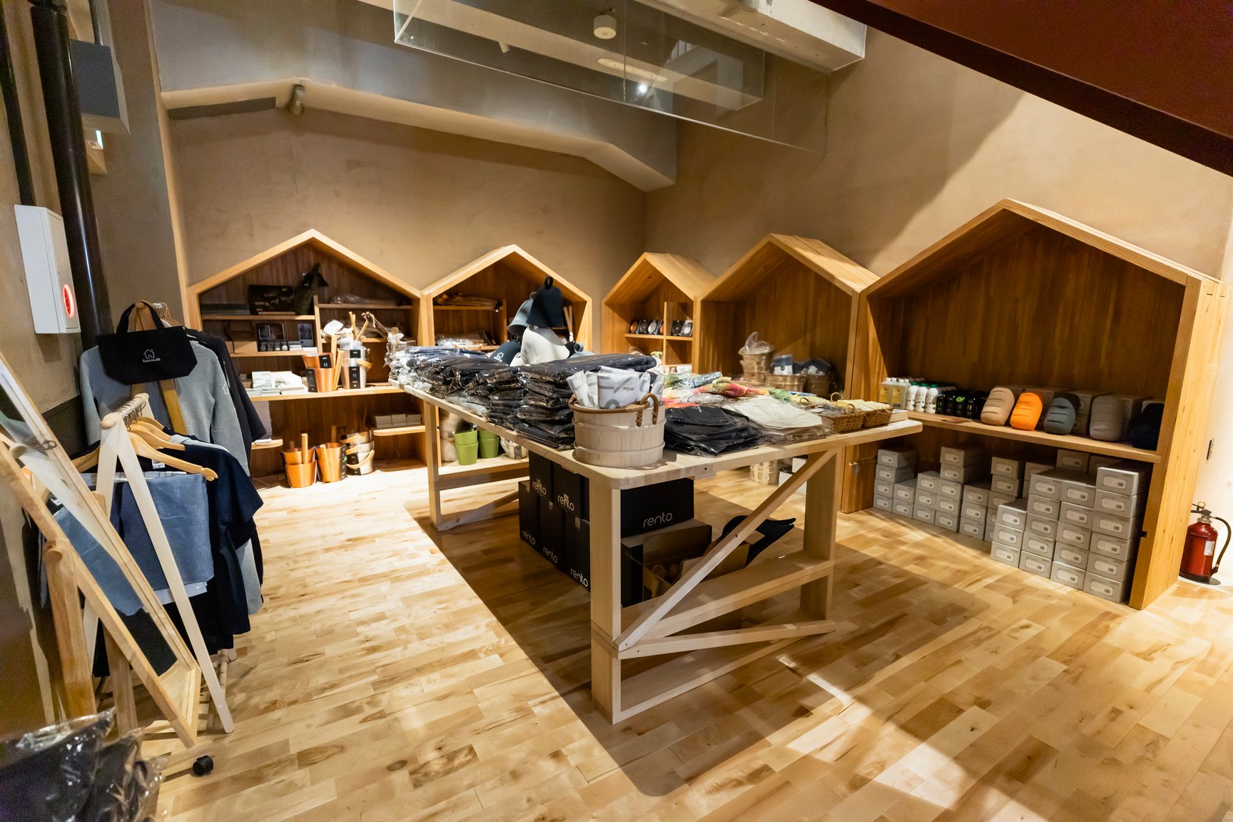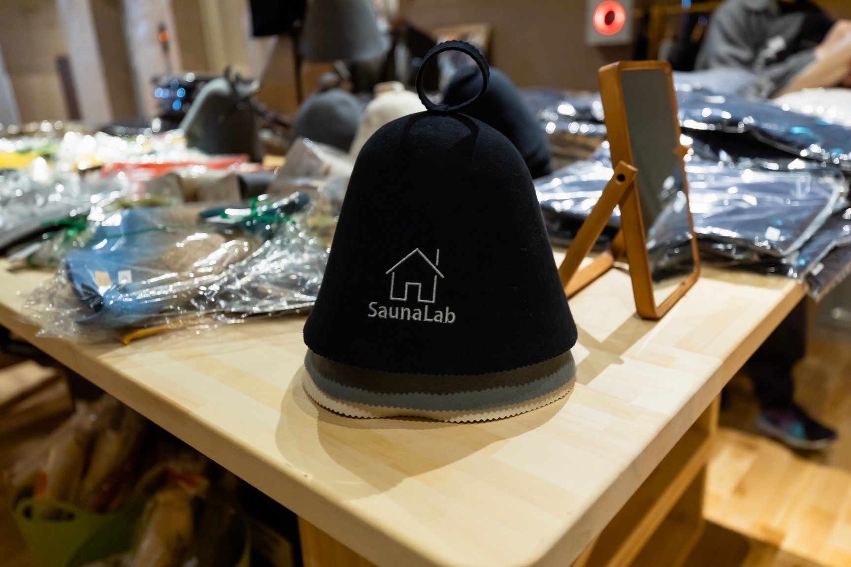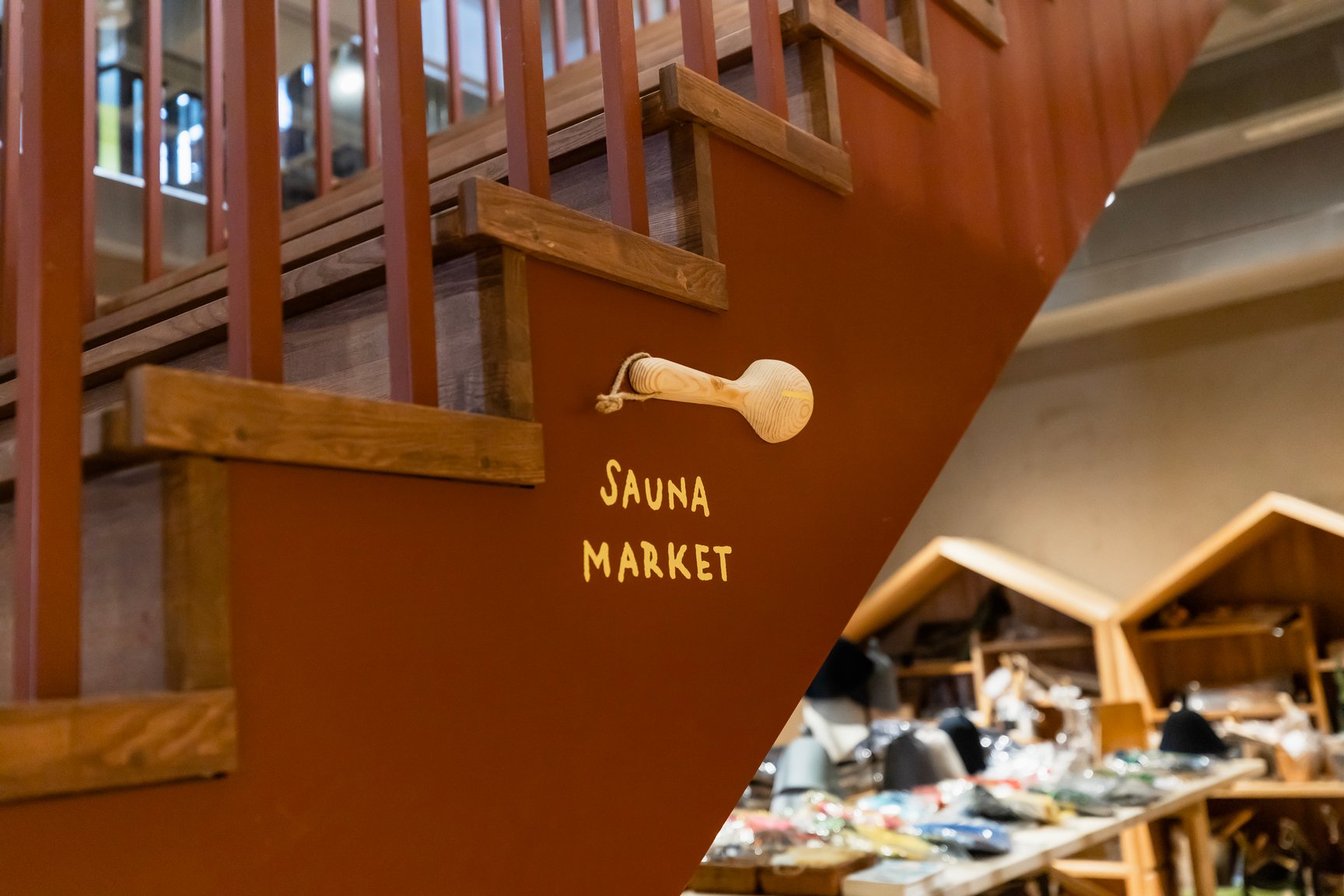 地下1階のサウナラボは、フィンランドサウナの起源とも言われる地面に穴を掘るマーサウナから着想して設計。ロビーの壁の色を土をイメージした茶色に仕上げ、木の根をイメージした枝を装飾としてあしらった。ロビーにはサウナハットや桶、サウナ室用クッション、時計、サウナラボのオリジナルグッズなどが並ぶサウナマーケットと、ウェルビーの米田がセレクトしたサウナにまつわる書籍を並べたパブリックスペースを設ける。