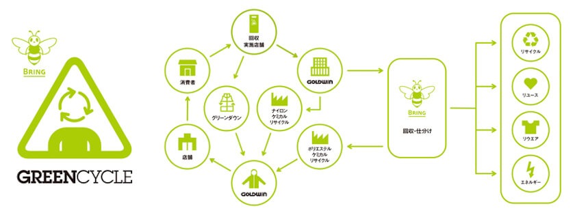 セブツーゴールドウインは、事業を通じた環境保存の取り組みとして実施しているリサイクル活動「GREEN CYCLE」において、昨年の1年間で3308.2キログラムの服を回収した。「GREEN CYCLE」はメーカーやブランド、質、状態に関わらず、店舗の回収ボックスを使って服を回収し、新たな製品の原料にリサイクルする取り組みで、2009年にスタートした。回収ボックスの設置店舗は2021年3月末時点で全国の直営店130店舗。昨年の回収重量3308.2キログラムは二酸化炭素の発生量に換算すると24877.7キログラムとなり、1777本の杉の木が1年間に吸収する二酸化炭素量に相当する。回収した服のうち、ポリエステルやナイロン製のものは、高純度の原料に戻すケミカルリサイクルを行い、ダウンウエアは新たなダウン製品の原料となる。