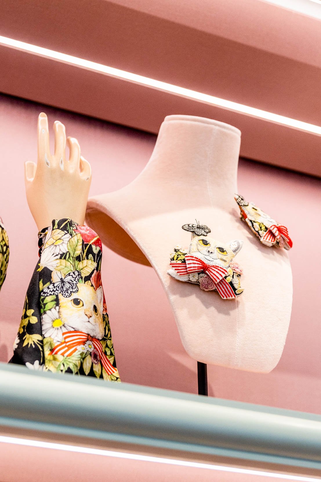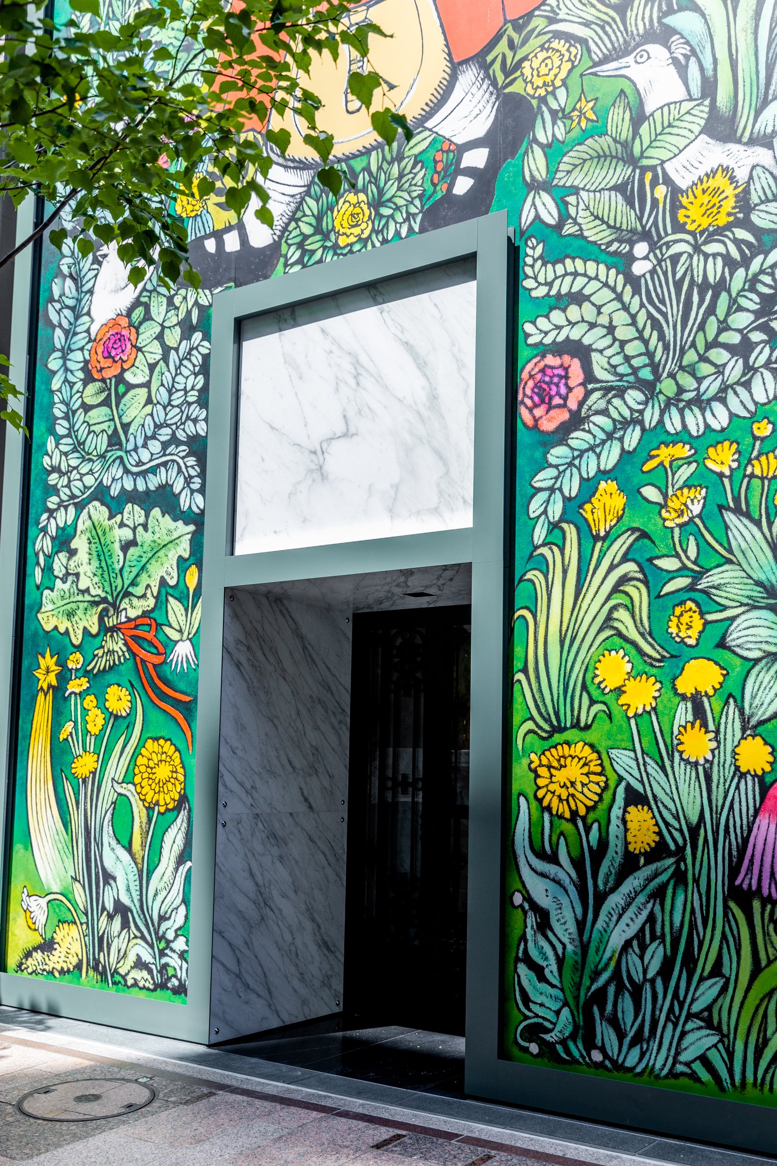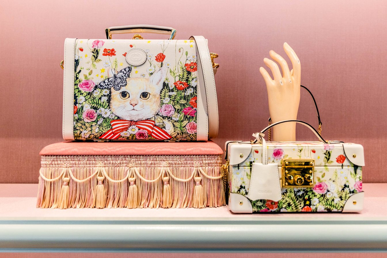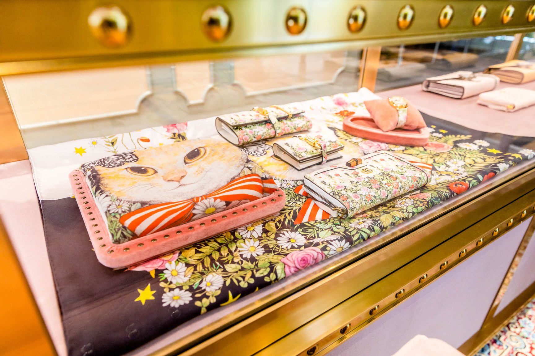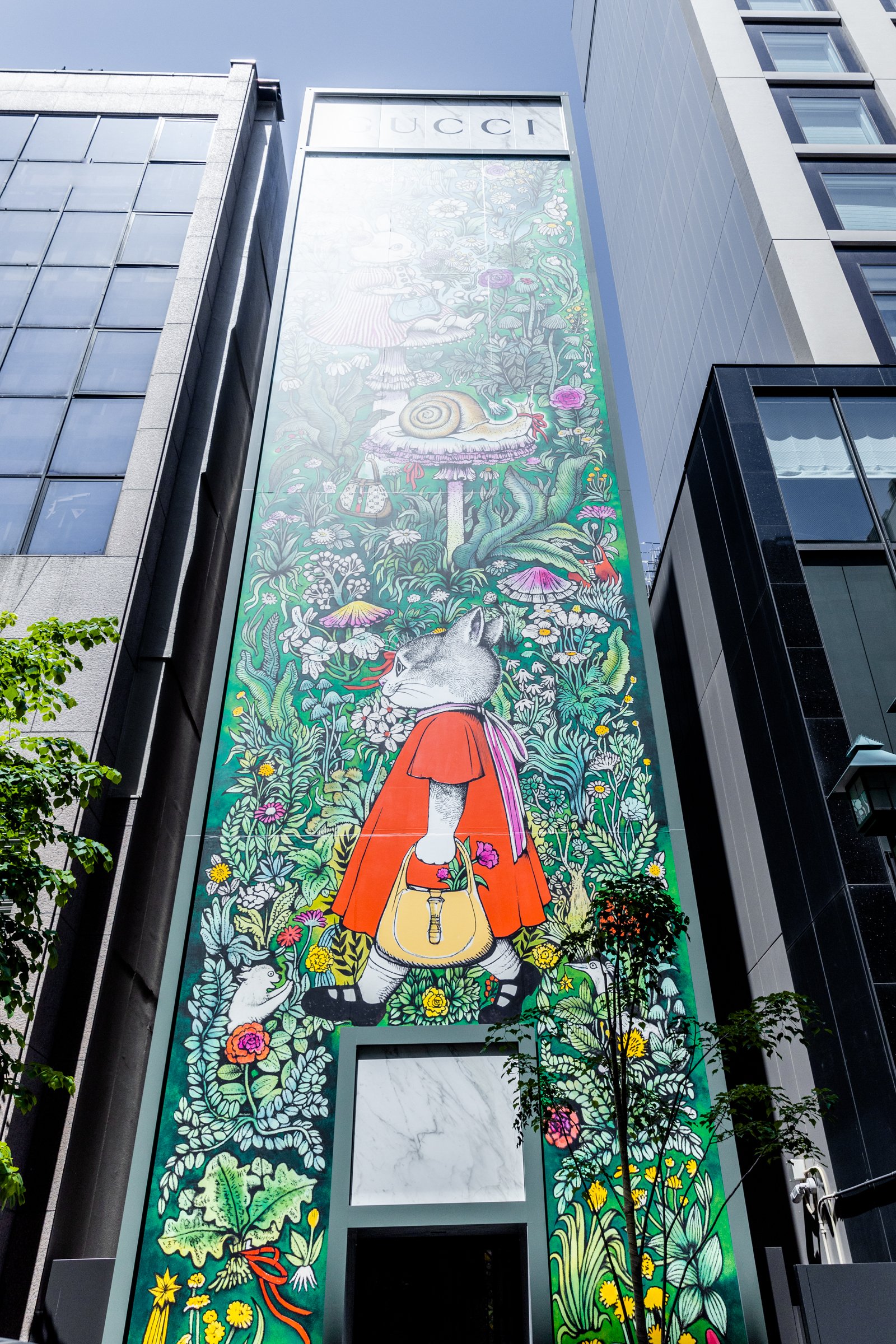 オープンを記念し、長年にわたりグッチとコラボレーションしている日本人アーティスト ヒグチユウコとのグッチ並木限定コレクションを29日に発売。春の庭園をイメージしたオリジナル作品で彩られたバッグやアクセサリーなど全16型を展開するほか、並木通り沿いに面したレストラン専用の入り口には猫や庭園のアートワークが施されている。