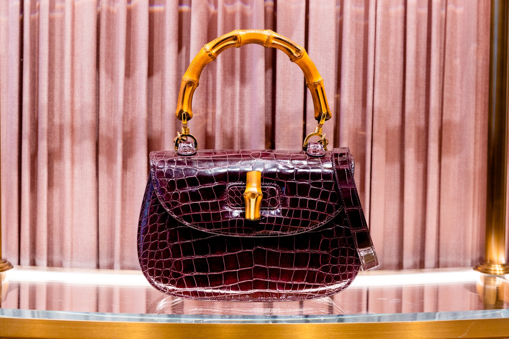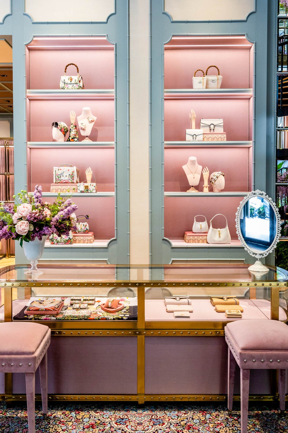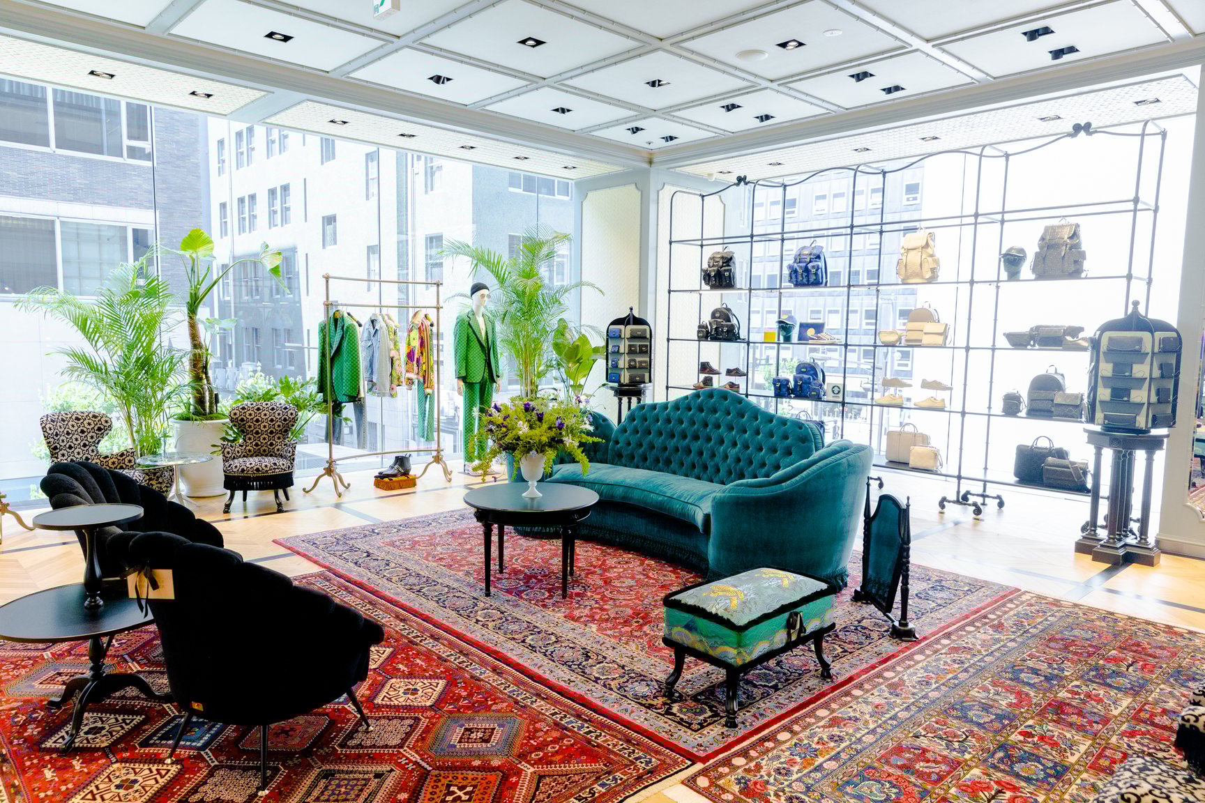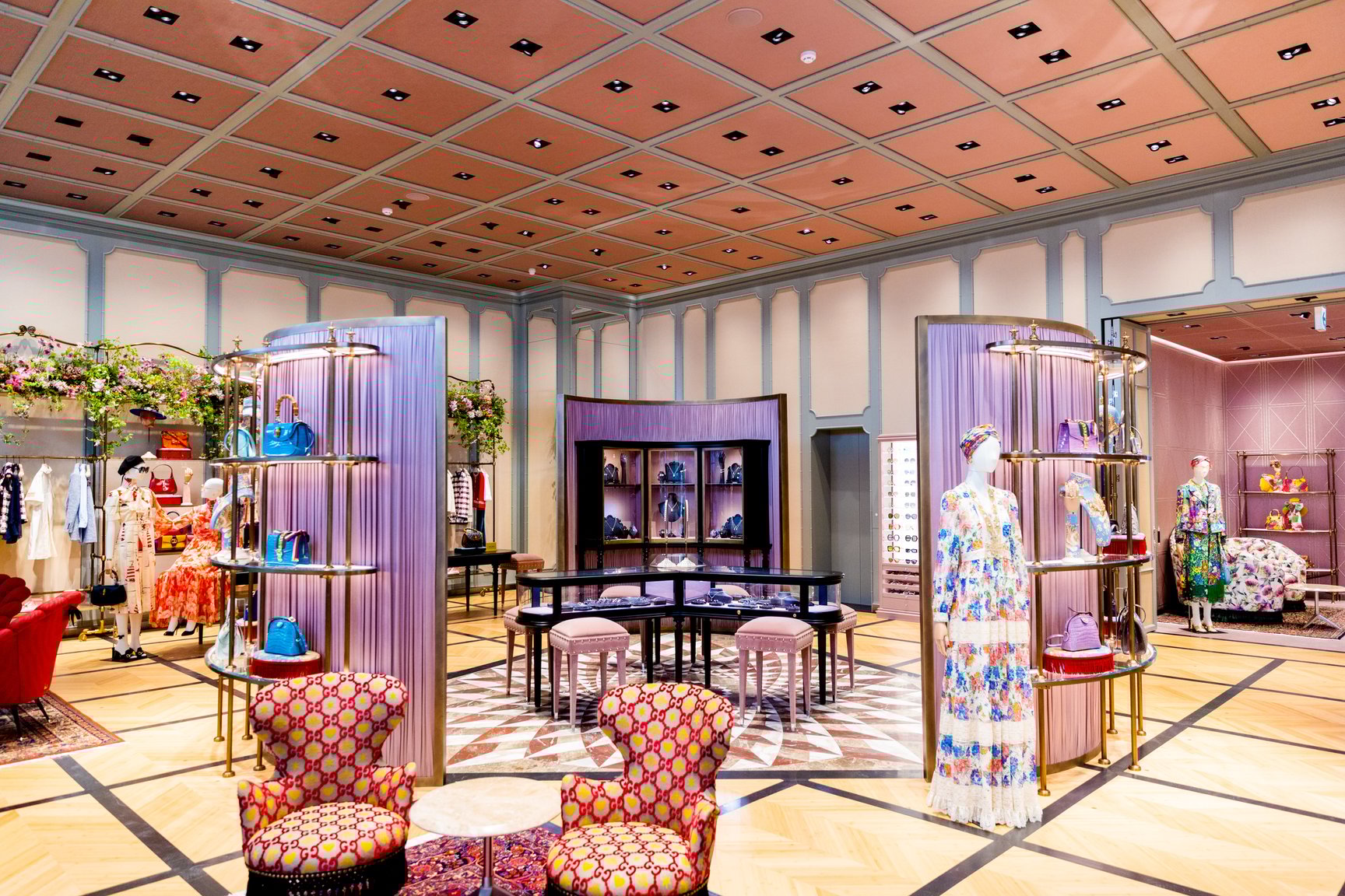 天井や壁の内装で随所に見られる竹や網代(あじろ)を想わせるディテールはこのショップのためにデザインされたもので、日本の伝統的な意匠とグッチのコンテンポラリーでロマンチックな装飾を融合。自然光を取り込む店内は広々としたフィッティングルームやグッチデコールのインテリアなどを配置した贅沢な空間使いで、ラグジュアリーな雰囲気を演出している。