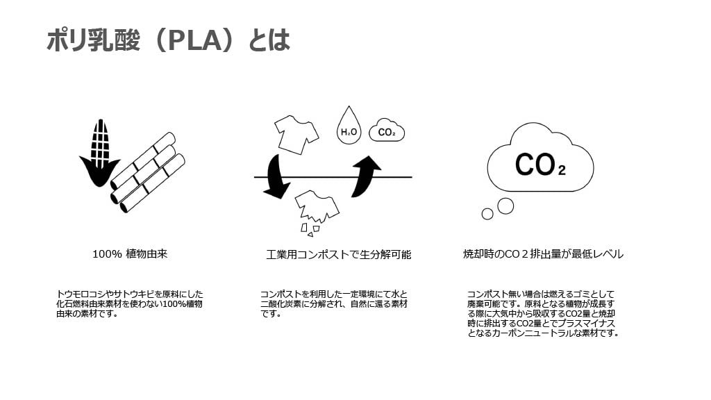 まず「ポリ乳酸」は一定の環境で水と二酸化炭素に分解することができる生分解性(=土に還るということ)の素材です。また、植物由来なので貴重な資源である石油を消費せず、燃やしても大気中のCO2を増やさないカーボンニュートラルと認められています。私たちは使用済みの「PlaX Fiber(プラックスファイバー)」を回収し、生分解させることでファッション業界の廃棄問題にも一石を投じたいと考えています。さらに素材自体が弱酸性で抗菌なので、お肌が敏感な方や赤ちゃんにも安心しておすすめすることができます。