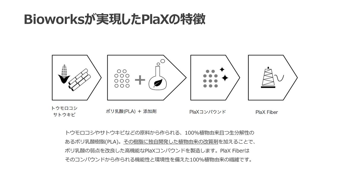前身となるバイオベース株式会社が2006年に設立され、大阪大学のベンチャーキャピタルからの出資を受け、2015年にBioworks(バイオワークス)株式会社が設立。2018年に、石灰石を主原料とする素材「LIMEX(ライメックス)」を製造販売している株式会社TBMのグループ会社となる。「PlaX Fiber(プラックスファイバー)」を通じ、ファッション業界に革命を起こすことを目指す。