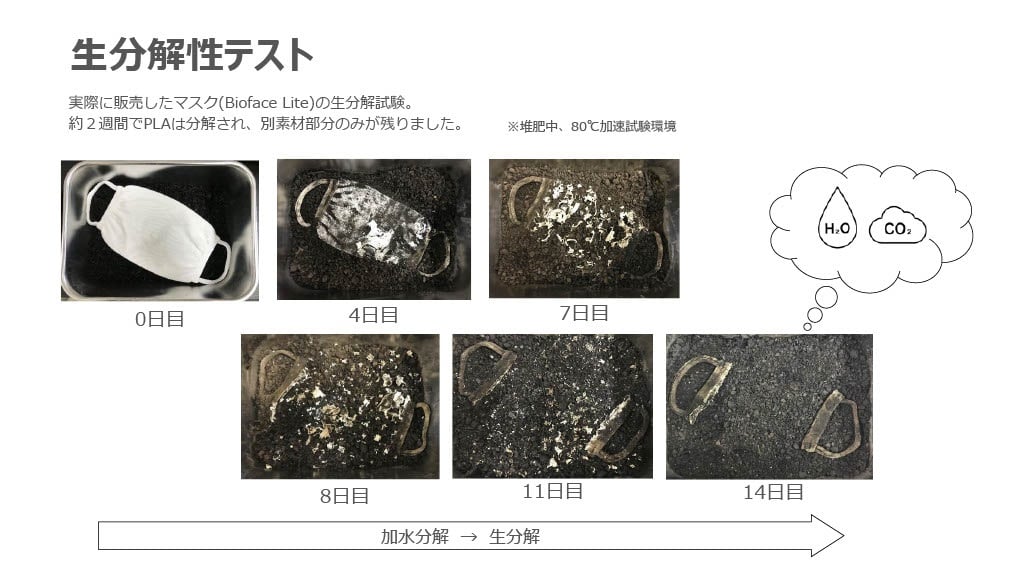 開発した「PlaX Fiber(プラックスファイバー)」で何かつくれないかと議論し、昨年はコロナ禍ということで「Bio Face(バイオフェイス)」というマスクをつくりました。このマスクはPLA(ポリ乳酸繊維)という添加剤を使っていない素材ですが、速乾性、抗菌性、消臭性、弱酸性という特長があります。ホールガーメントで有名な島精機さんでつくらせていただき、縫い目がないので耳が痛くなりにくく、シームレスなのでフィット感もあります。また、「ポリ乳酸」の特長である弱酸性で肌にもやさしいマスクです。工業用コンポストでの生分解性試験で、80度の加速度試験を行い、2週間で目に見えないほど分解し土に還ることが証明できました。これは不織布では当然ならない結果です。