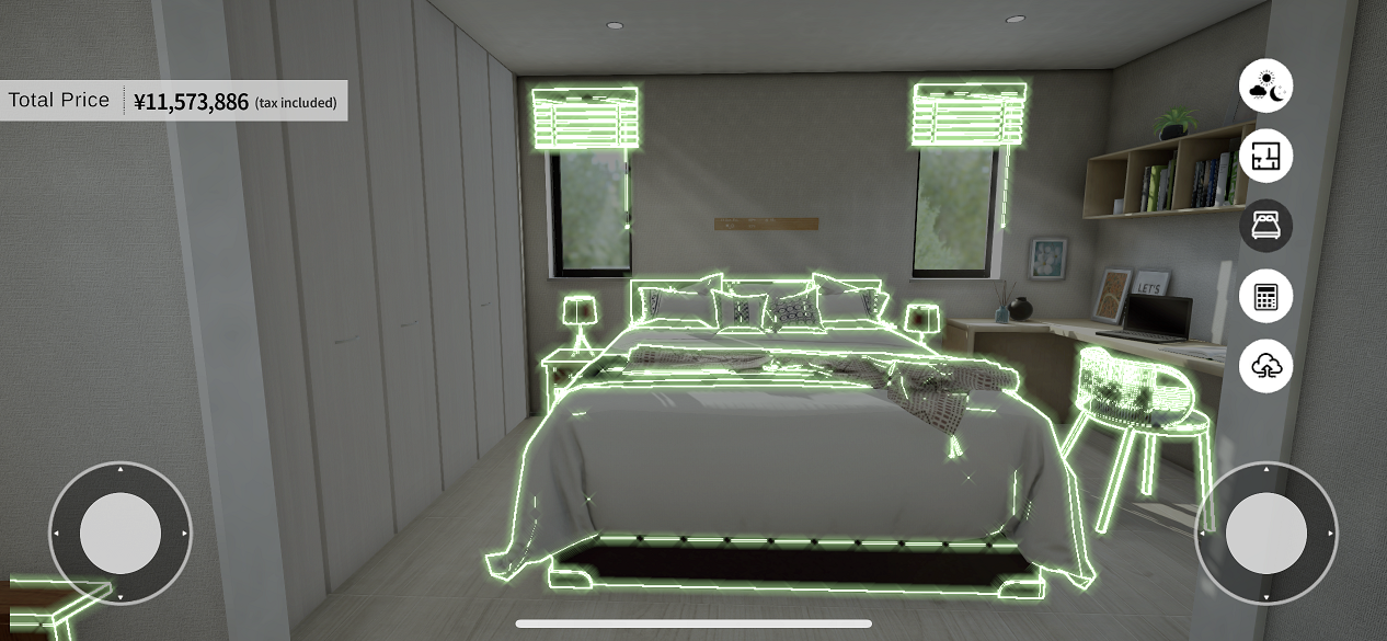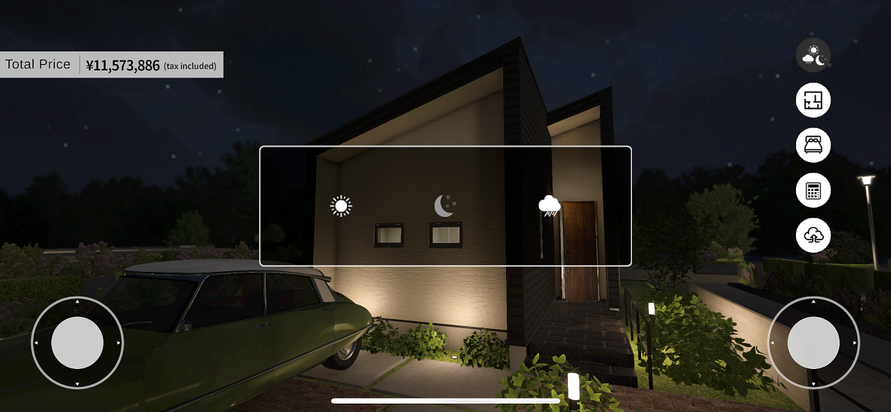 ユーザーは、家具、インテリア、照明などを配置し、スマートフォン画面上の左右のスティックを使って自分好みの家の中を歩き回ることが可能。家の中だけでなく、外観や昼・夜の時間帯、雨の日なども再現できるため、さまざまなシチュエーションを疑似体験することができます。また、作った家は保存・共有が可能なので、家族と一緒に理想の家づくりを楽しむこともできそうです。