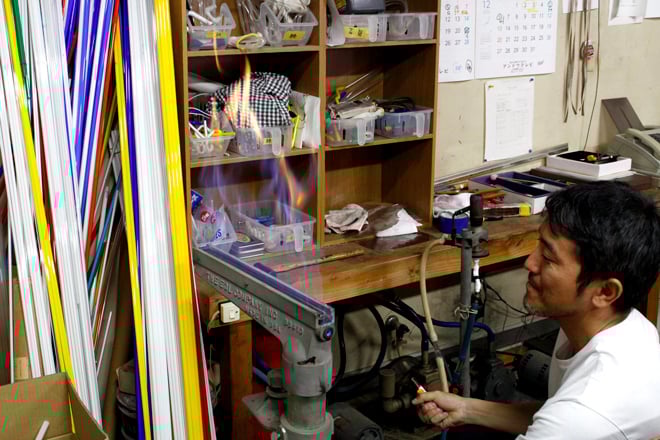 森山さんが実際にネオン管を曲げる工程を見せてくれた。アメリカ製のバーナーで曲げたい部分に炎を当てると、ガラスの色が変わる。熱が残って柔らかいうちに、一気に曲げる。繊細な素材のため、注意しなければ作る途中にすぐに割れてしまう。