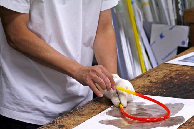 直線のガラス管をバーナーを使って曲げ、更にガスを注入する必要があるため、複雑すぎるものを小さいサイズで作るのは難しいが、逆に大きいものであればガラス管の太さから逆算してたいていのものは作れると話す森山さん。複雑な文字の場合は何本かを組み合わせて必要のない部分を塗装し光らないようにするなど、パズルのように組み合わせて作られる。着色されているガラスを使用すれば点灯していない日中でも色がついた状態になり、透明のもの(点灯すると中のガスや内側の蛍光塗料によって色がつく)はウインクさせるなど動きのあるネオンサインを作ることができる。更に点滅の速さやパターンの種類を変えるなど、目的やイメージに合わせて提案し、出来上がった図案をもとに島田社長がガラス管を曲げ、ガスを入れる。