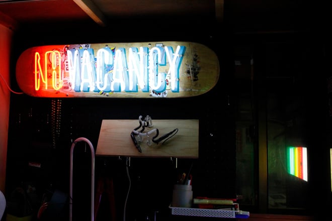 京浜急行電鉄「大鳥居駅」から徒歩10分弱、小さな工場が数多く並ぶ地帯にある「(株)シマダネオン」という文字の掲げられた小さな建物。こちらの1階が工場になっていて、入ってすぐ、スケートボードに乗せられた「NO VACANCY」のネオンが目に入る。