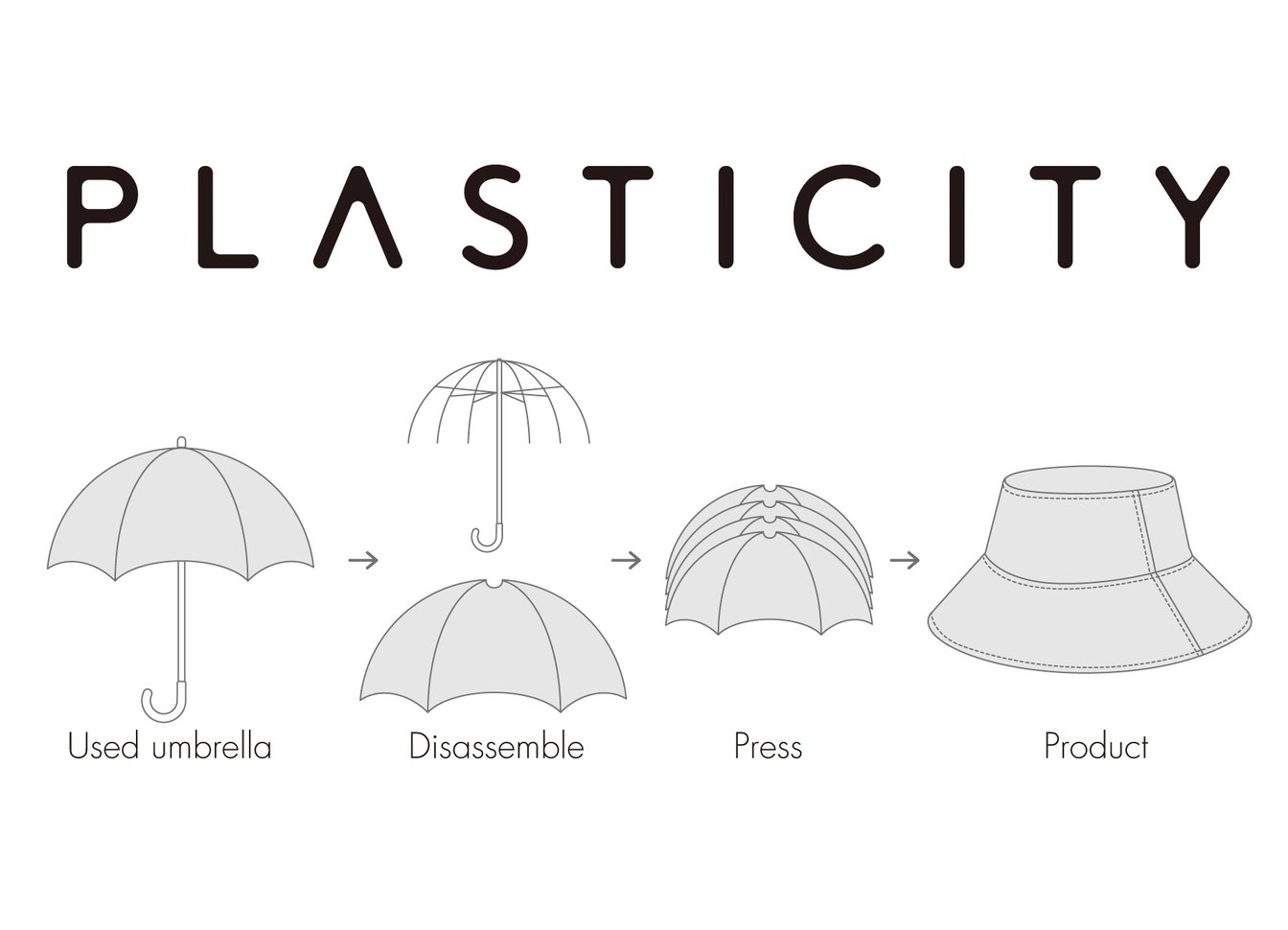 モンドデザインがクリエイター齊藤明希氏と共同開発をする、捨てられたビニール傘をそのままの状態で再利用するブランド「PLASTICITY(プラスティシティ)」から、国内の帽子職人の手により作られた新製品「アンブレラ バケットハット」11,000円(税込)が販売中だ。