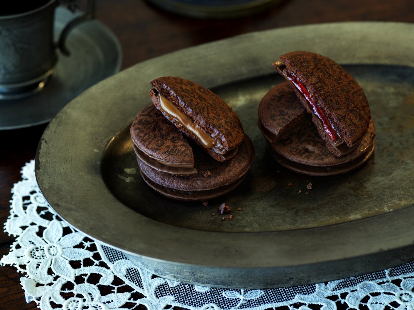 濃厚なヘーゼルナッツクリームと、爽やかな酸味のストロベリーソースの2つの味がアソートになっている、贅沢な味わいのショコラサンドですよ。