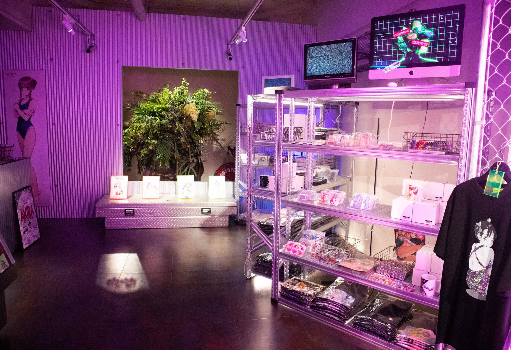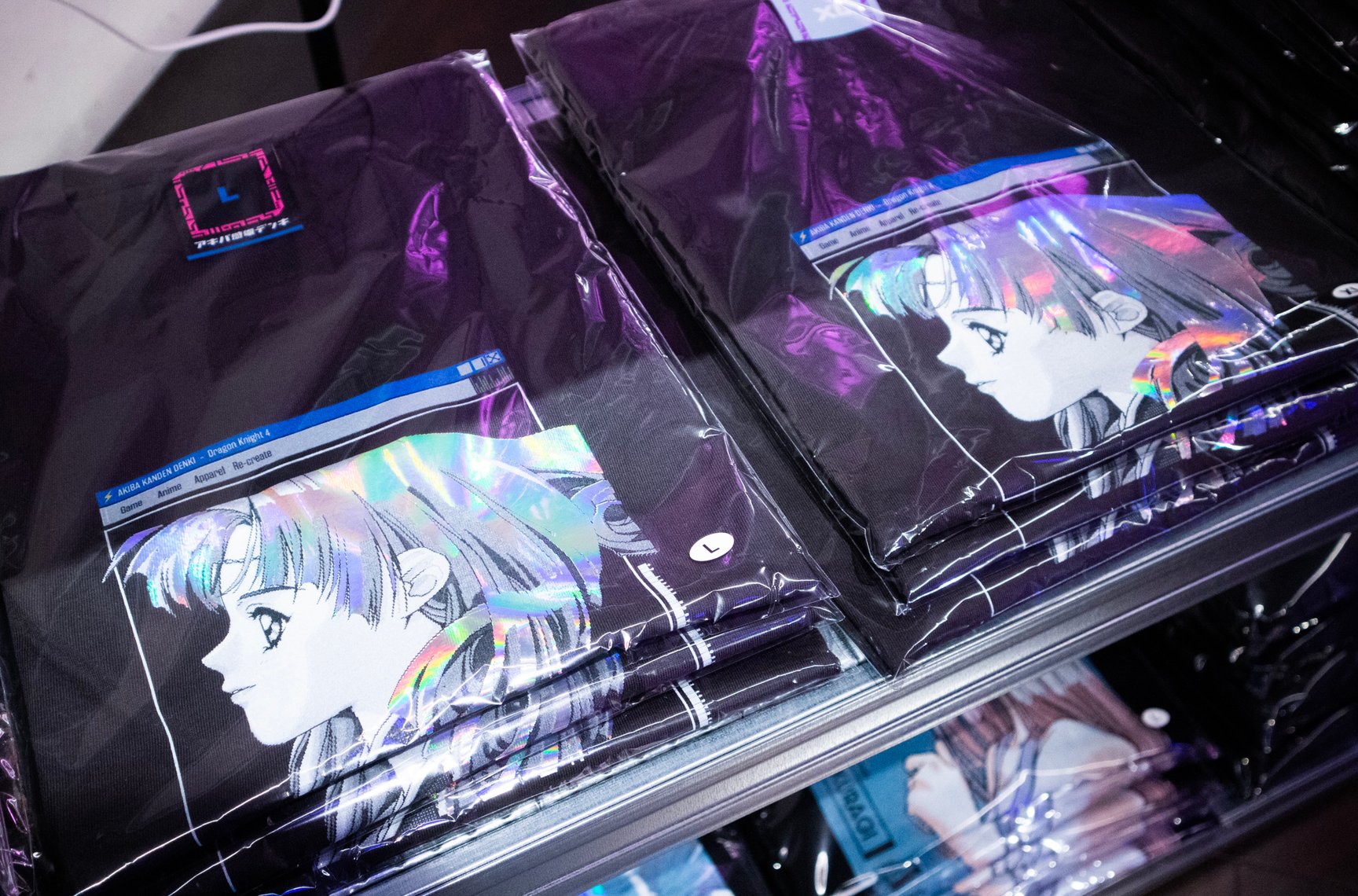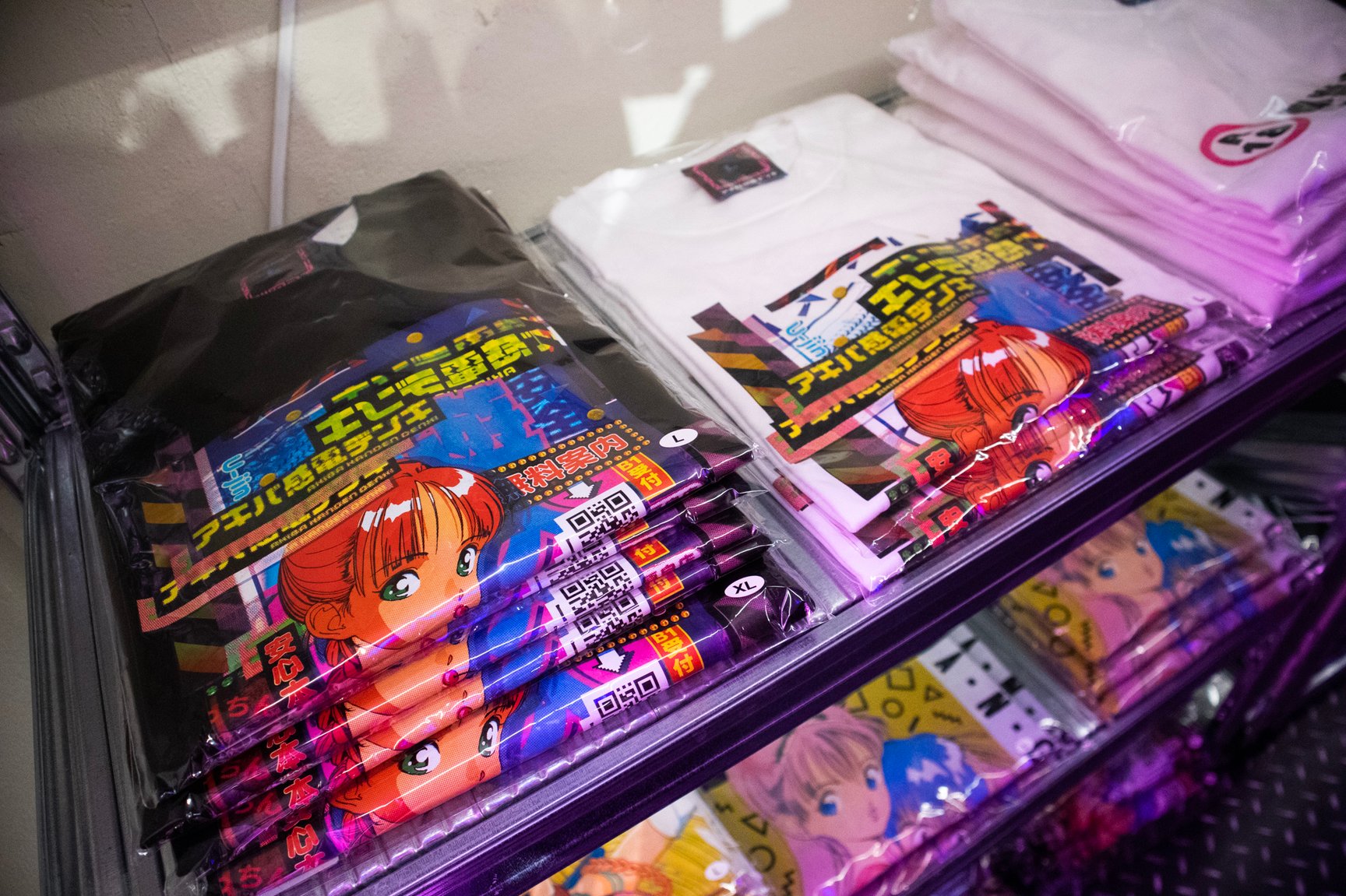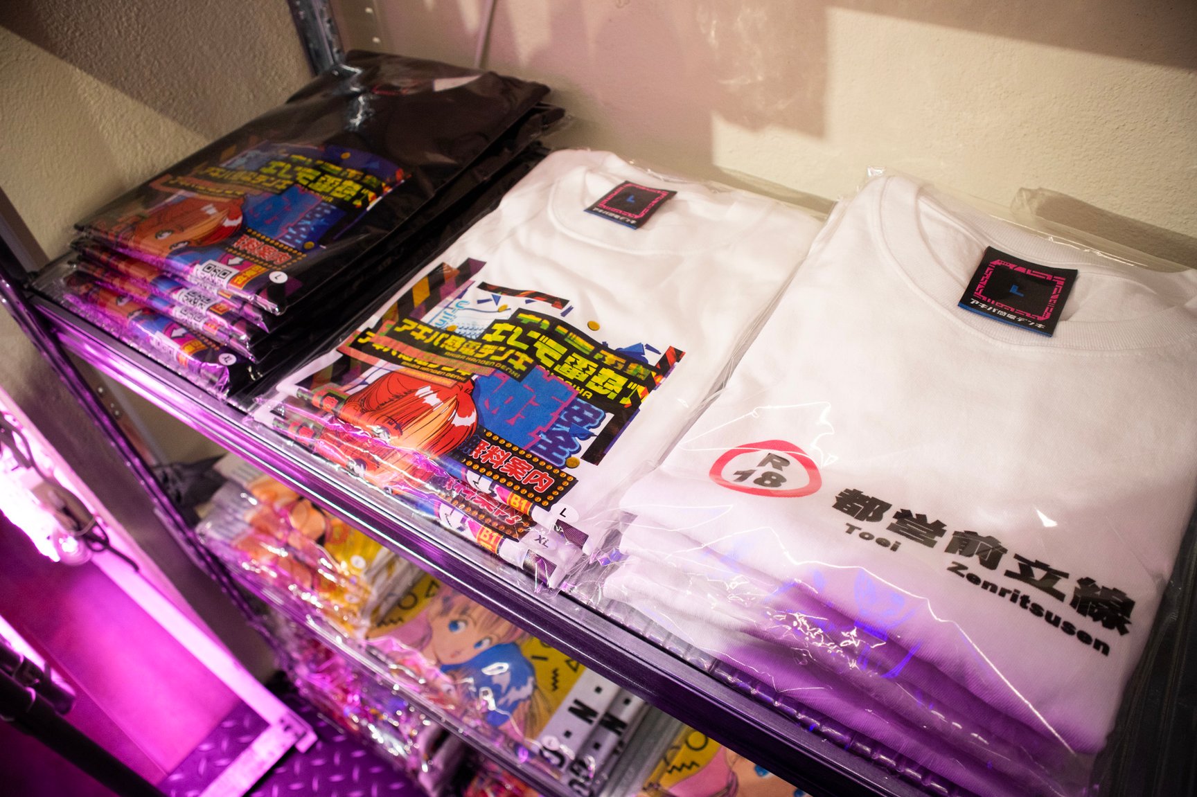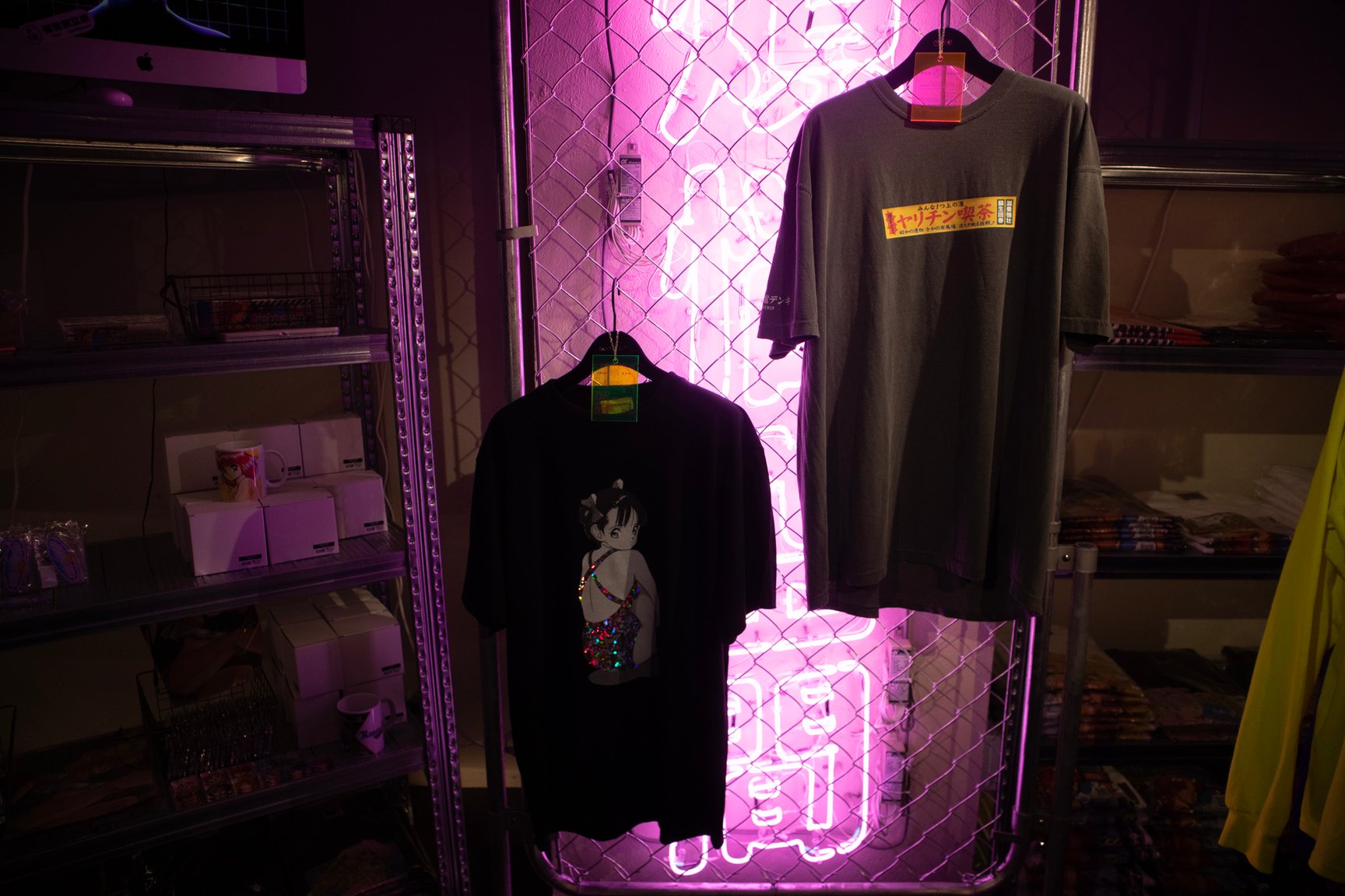 一見するとアパレルショップには見えない怪しげな雰囲気が漂う店内では、常時アパレル商品50種類以上を揃えているほか、雑貨や複製原画、ステッカーなどが並ぶ。「ANGEL」「校内写生」などを手掛けた漫画家 遊人の作品を落とし込んだアパレルをはじめ、1990年代のアダルトゲームや漫画作品をモチーフにしたオリジナルアイテムを展開し、新作は毎月入荷。このほか、大阪ミナミのバー「BAR メンヘラの壁」オーナーがプロデュースしたアパレルブランド「魔法企画」のアイテムを取り扱っている。「アキバ感電デンキ」のロゴ入りTシャツや、ホログラムをデザインの一部に配したグラフィックTシャツ、ステッカーなどが特に人気だという。