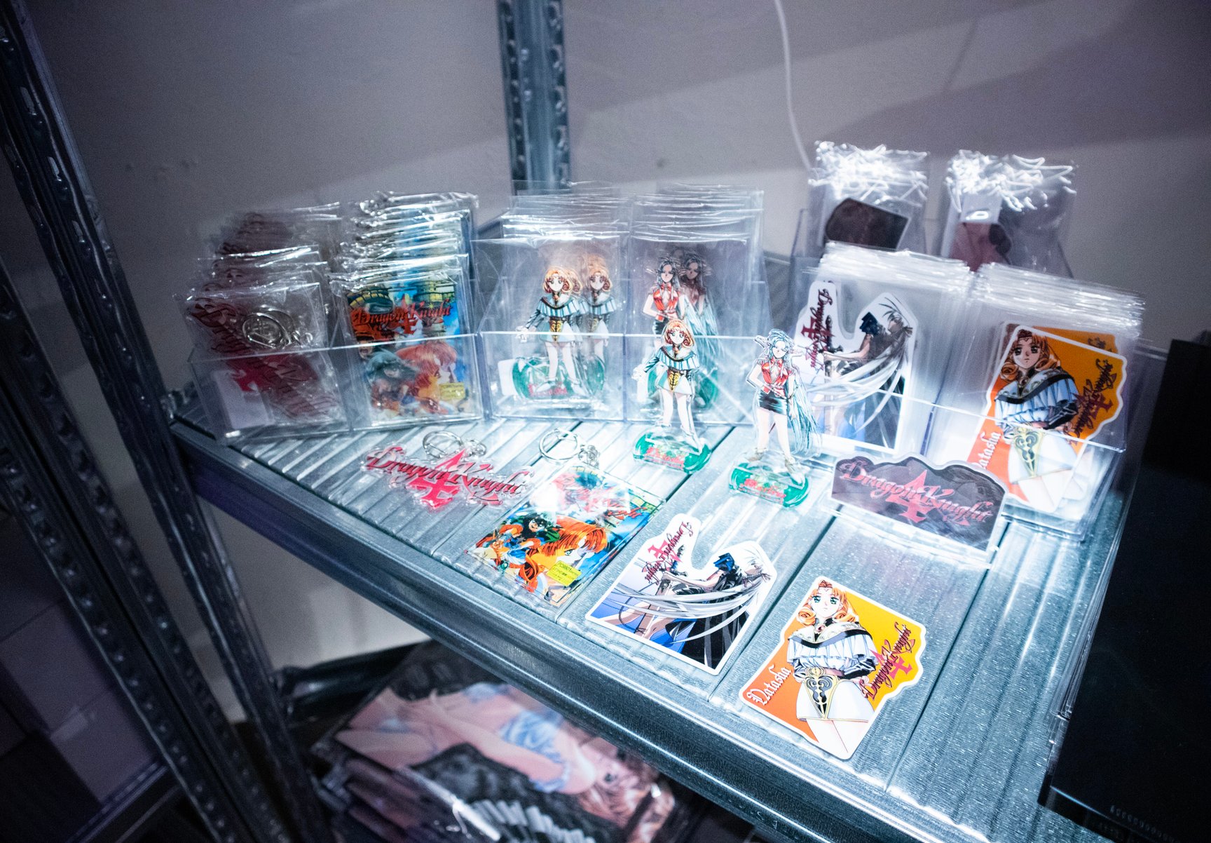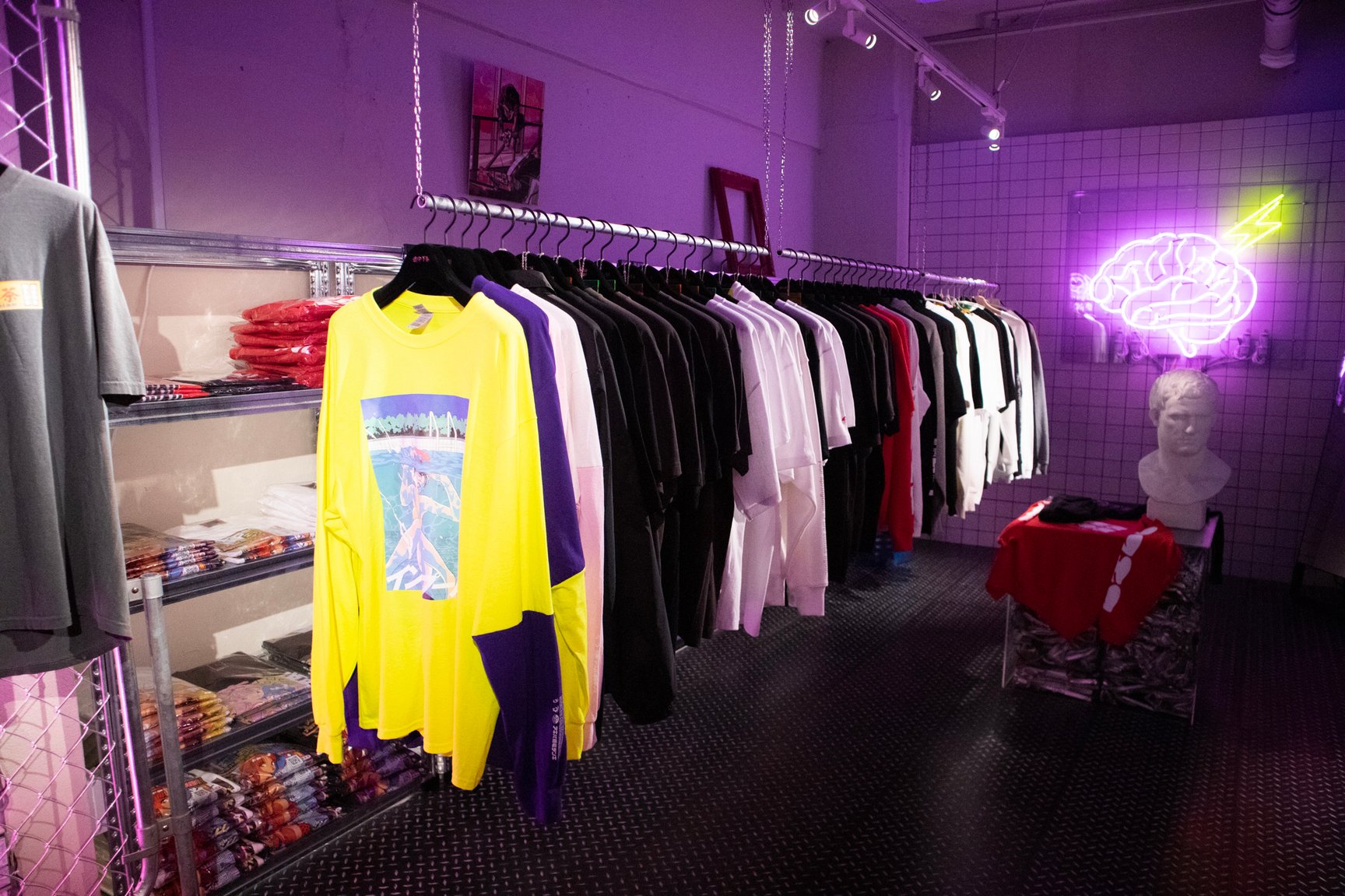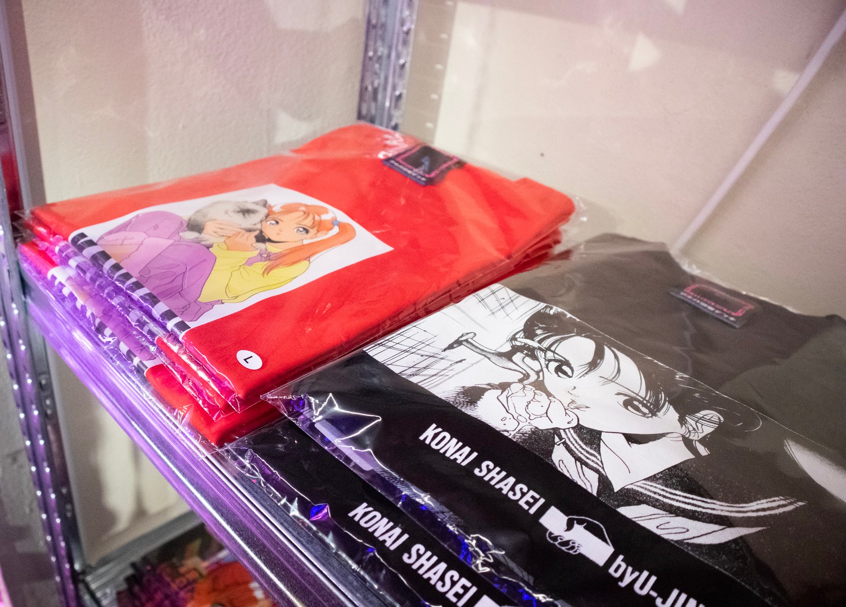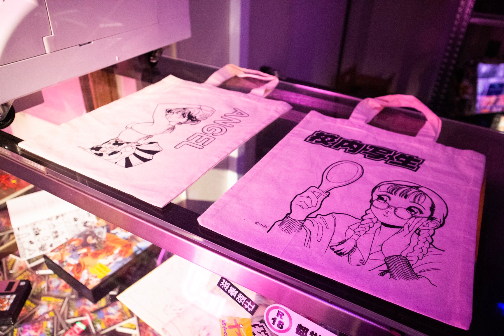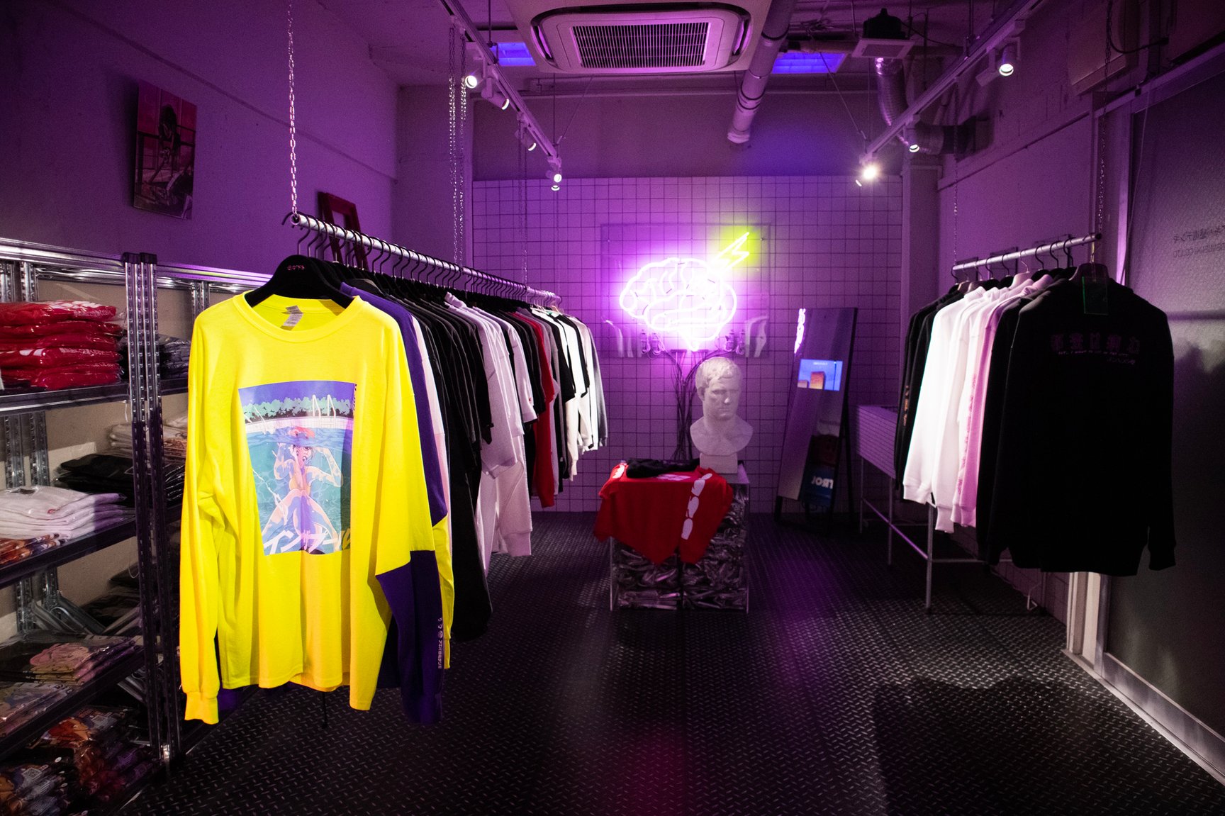 一見するとアパレルショップには見えない怪しげな雰囲気が漂う店内では、常時アパレル商品50種類以上を揃えているほか、雑貨や複製原画、ステッカーなどが並ぶ。「ANGEL」「校内写生」などを手掛けた漫画家 遊人の作品を落とし込んだアパレルをはじめ、1990年代のアダルトゲームや漫画作品をモチーフにしたオリジナルアイテムを展開し、新作は毎月入荷。このほか、大阪ミナミのバー「BAR メンヘラの壁」オーナーがプロデュースしたアパレルブランド「魔法企画」のアイテムを取り扱っている。「アキバ感電デンキ」のロゴ入りTシャツや、ホログラムをデザインの一部に配したグラフィックTシャツ、ステッカーなどが特に人気だという。
