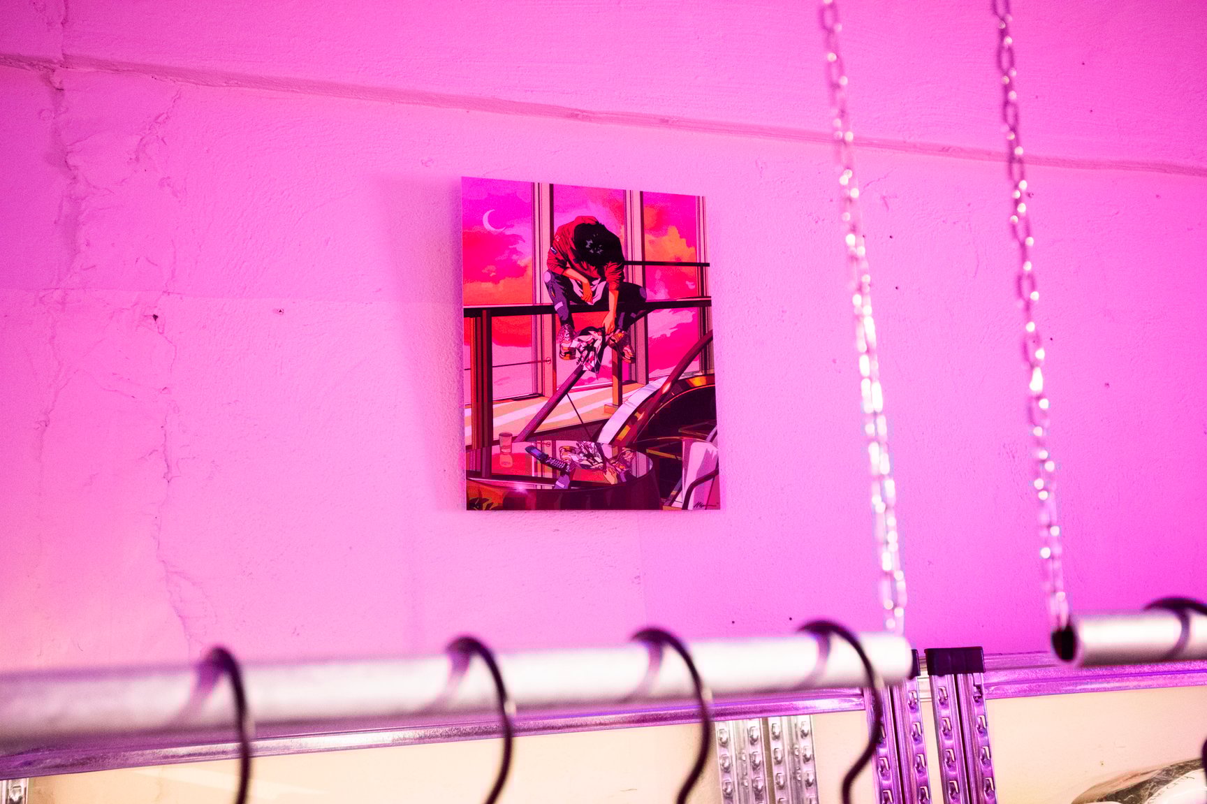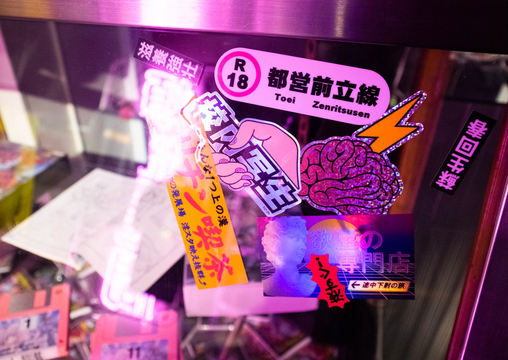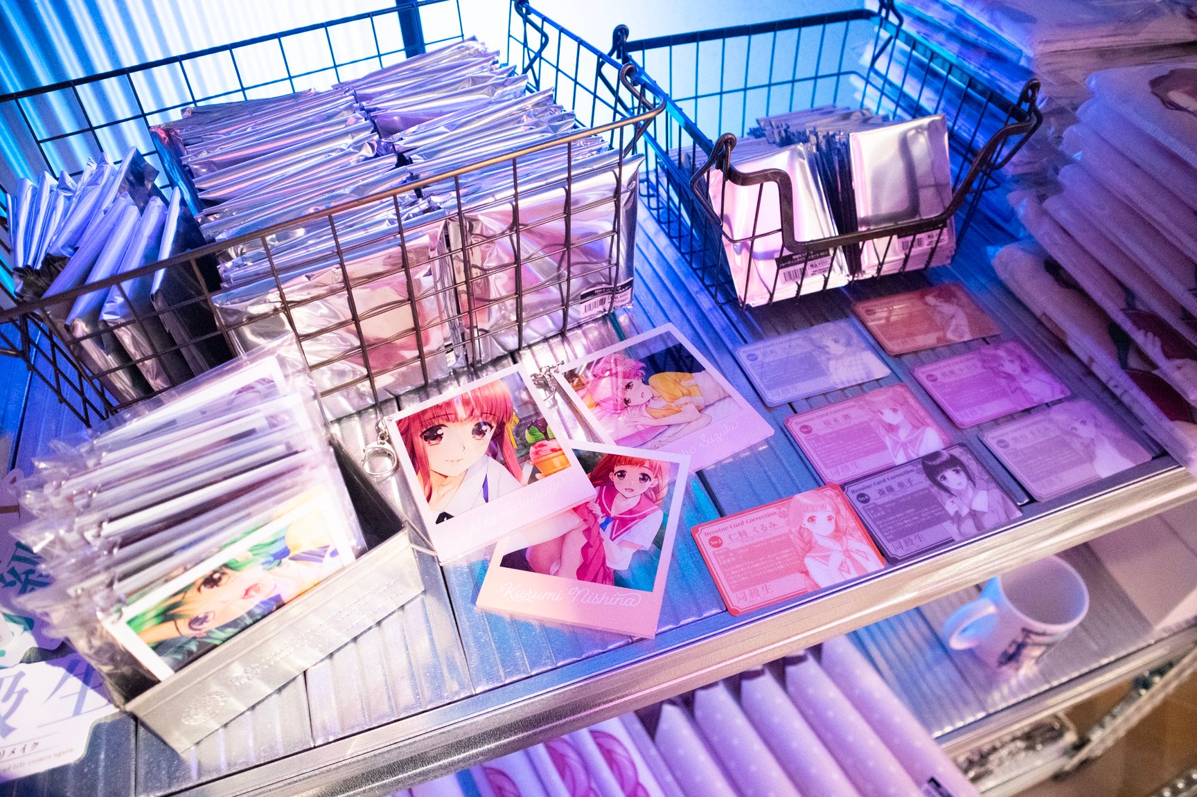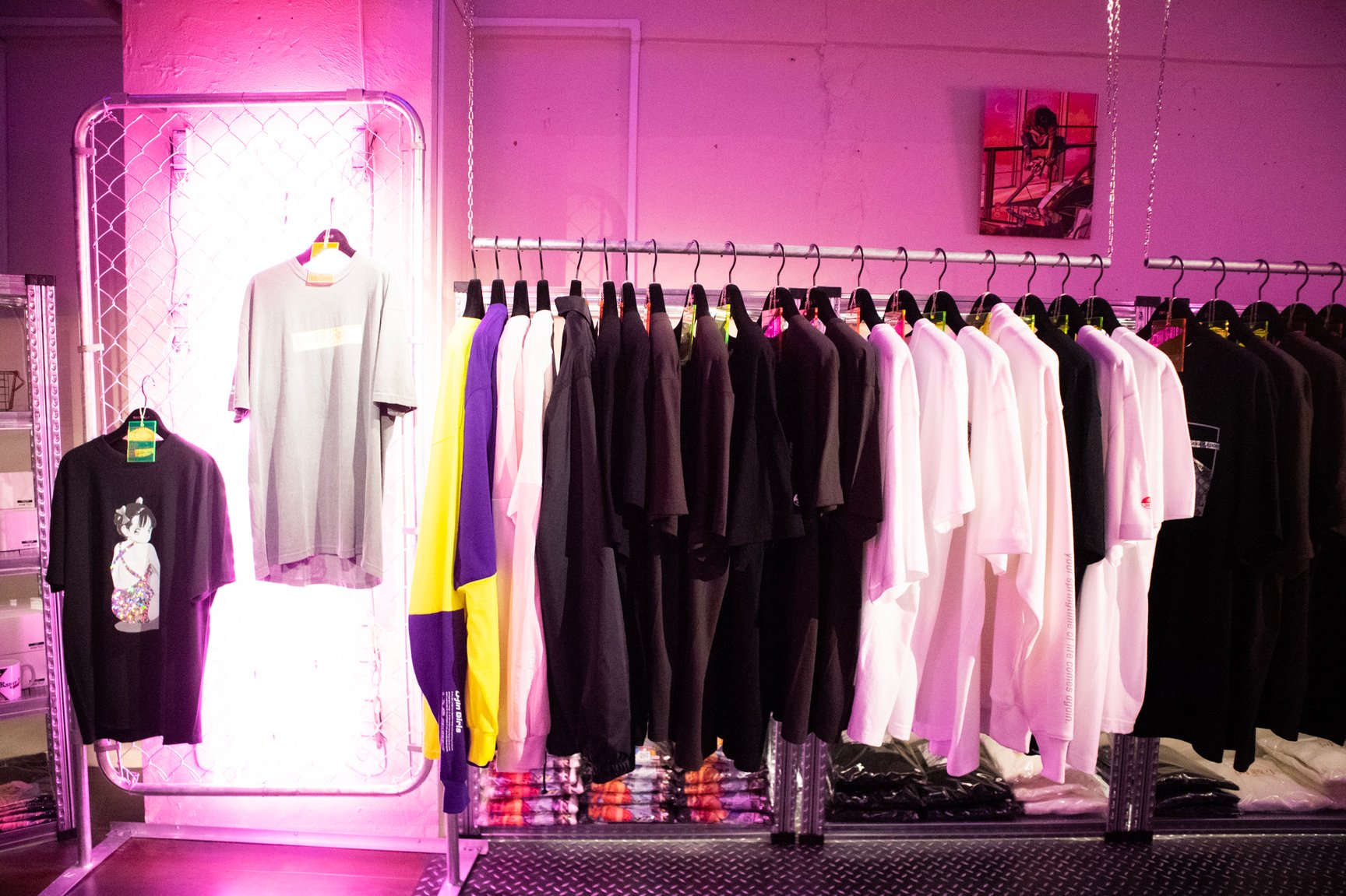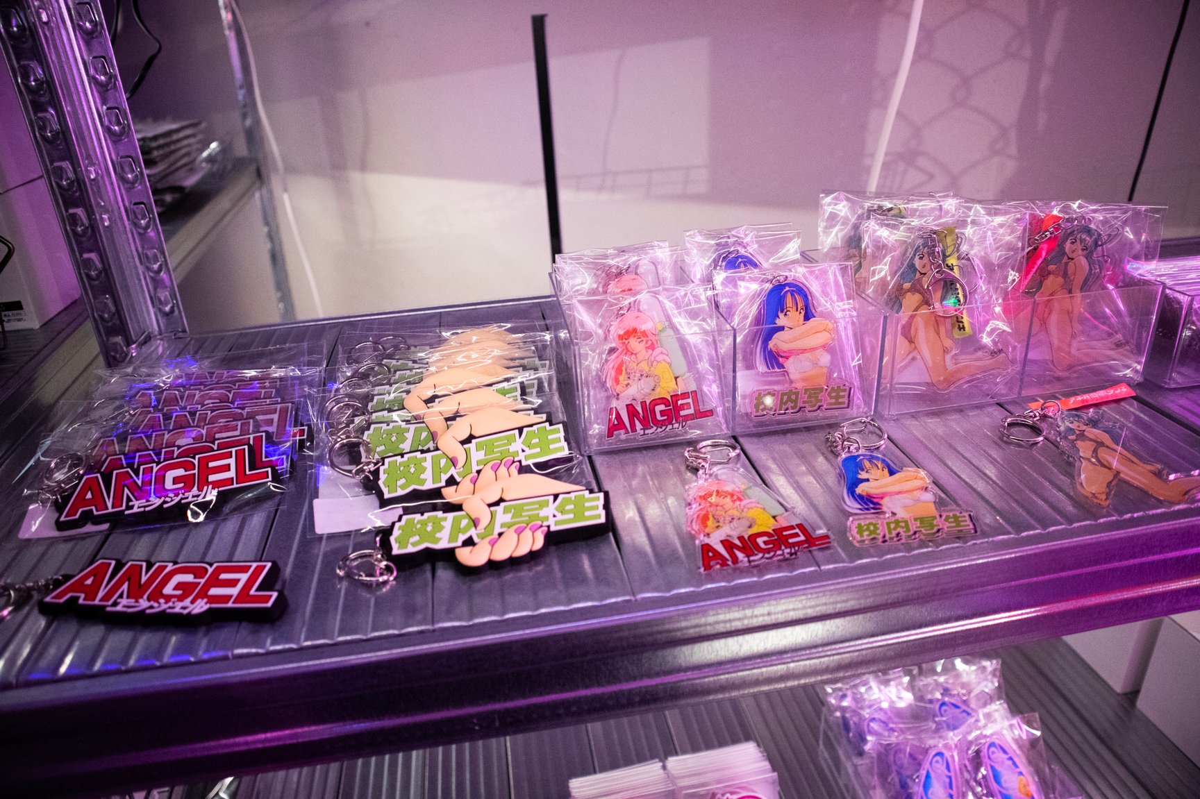 一見するとアパレルショップには見えない怪しげな雰囲気が漂う店内では、常時アパレル商品50種類以上を揃えているほか、雑貨や複製原画、ステッカーなどが並ぶ。「ANGEL」「校内写生」などを手掛けた漫画家 遊人の作品を落とし込んだアパレルをはじめ、1990年代のアダルトゲームや漫画作品をモチーフにしたオリジナルアイテムを展開し、新作は毎月入荷。このほか、大阪ミナミのバー「BAR メンヘラの壁」オーナーがプロデュースしたアパレルブランド「魔法企画」のアイテムを取り扱っている。「アキバ感電デンキ」のロゴ入りTシャツや、ホログラムをデザインの一部に配したグラフィックTシャツ、ステッカーなどが特に人気だという。