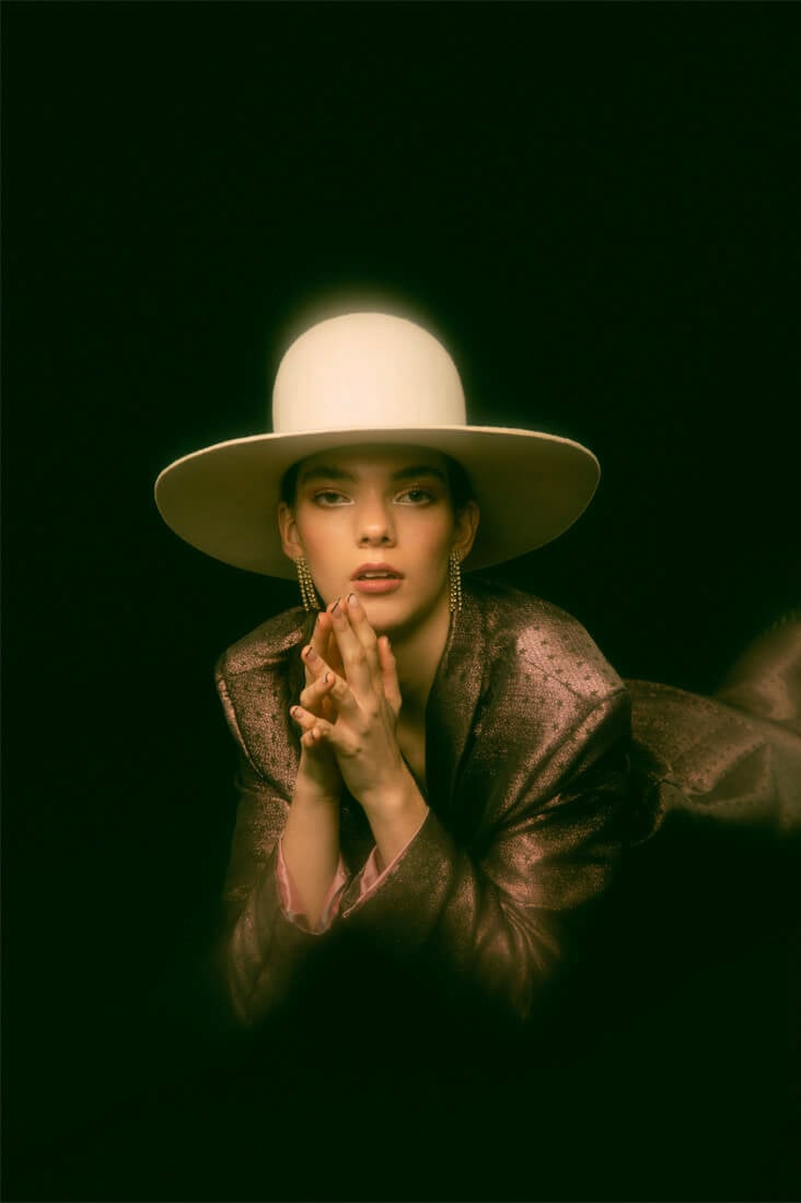 jacket and trousers by CORINA PLUS IRINA BARCELONA, hat by JUDIT MATAS FONT, earrings stylist’s own