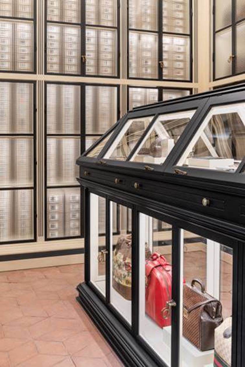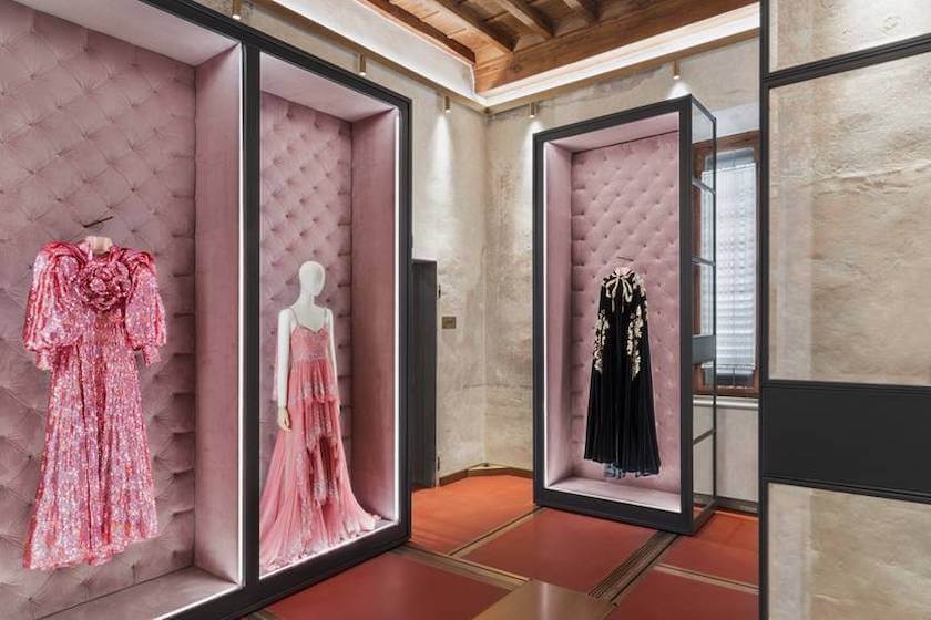地下1階を含む全5フロアに残る19世紀の装飾、18世紀シュルレアリスムの騙し絵、17世紀末のフレスコ画を初めとするそれ以前の装飾の痕跡は、ありのままに、あるいは本来の華麗な姿に復元されている。唯一の大きな改装が行われたのはエントランスホールで、より多くの光を取り入れるために1990年代に付け加えられた天蓋が取り除かれ、中央のポーチはオリジナルの優雅なプロポーションに復元された。その他の家具からランプ、食器棚まで全てが宮殿の修復・再生と同様に繊細なデザインが施され、「グッチ」の歴史を伝えるコレクションを展示するにふさわしい場所として生まれ変わった。1階には、ヴィンテージハンドバッグが展示される「Hortus Deliciarum(歓喜の庭)」やヴィンテージ&コンテンポラリージュエリーが展示される「Le Marché des Merveilles(驚きのマルシェ)」。2階には、「The Alchemist’s Garden(錬金術師の庭)」「Aveugle par Amour(盲目的な愛)」などといった想像力をかきたてる名前がつけられた部屋にスカーフやドレスなどテキスタイル作品とシューズのアーカイブが収められる。