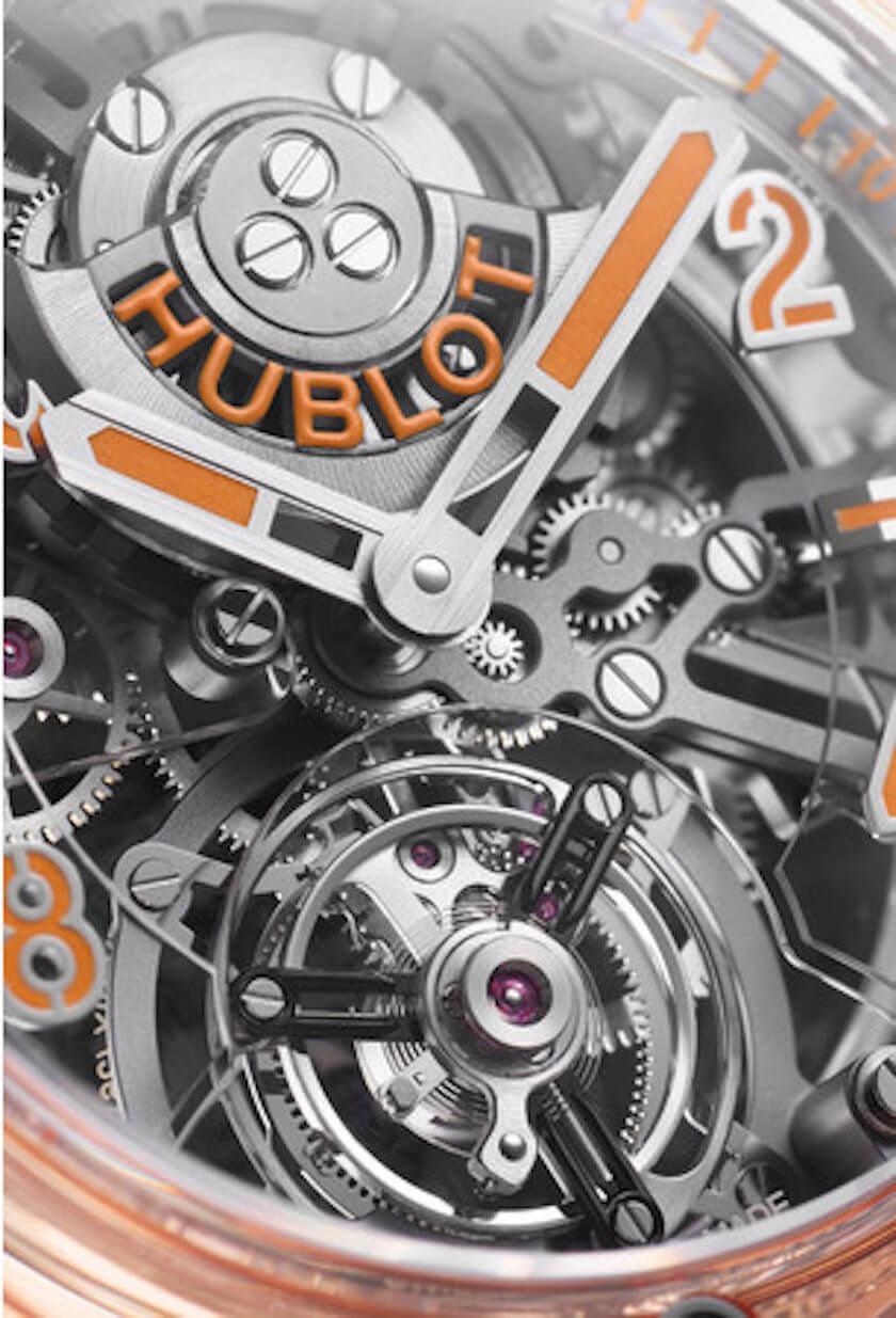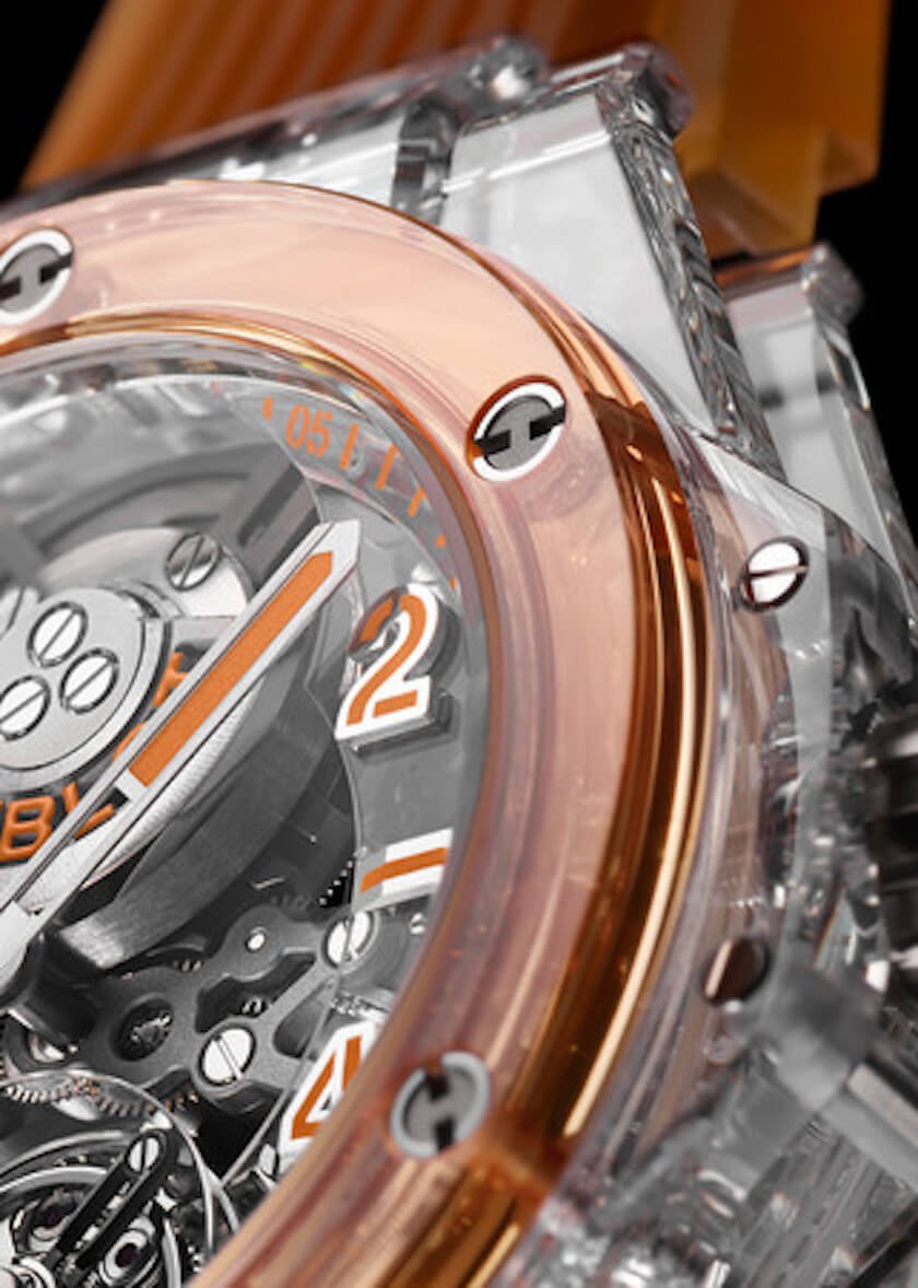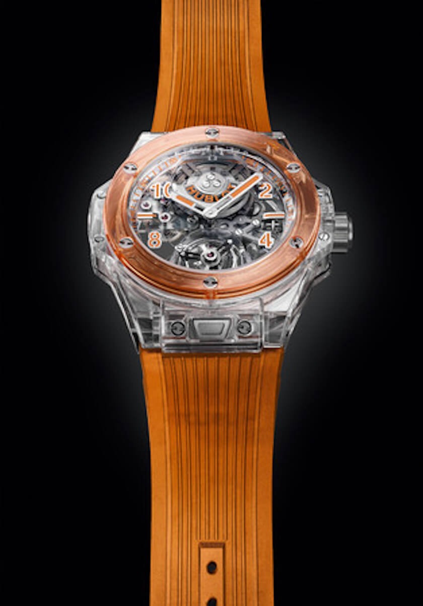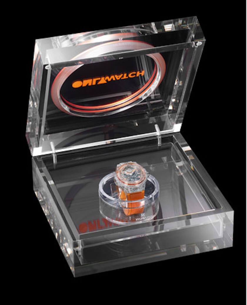 サファイアクリスタルのクリアケースとオレンジのベゼルは、ウブロの卓越した技術の象徴。世界で初めてウブロが開発した鮮やかなオレンジのサファイアは、チタニウムとクロムの融合で実現された。ダイナミックでポジティブなこの色調は、オンリーウォッチの姿勢とも一致している。同じくサファイアクリスタル製のダイアルからは、今年1月に発表された新しい自社製の自動巻きトゥールビヨンムーブメントの機構を見ることができる。サンレイブラッシュ加工とサンドブラスト加工を施した22Kホワイトゴールド製マイクロローターをダイアル側から見えるようにすることで、洗練された印象と存在感を演出。香箱受け、自動ブリッジ、トゥールビヨンバレッタの3つのブリッジにもサファイアクリスタルを採用し、初めてムーブメント自体にもサファイアが組み込まれた。時針・分針には蓄光性夜光顔料のスーパールミノバが塗布され、数字にはオレンジが施された。サファイアクリスタル製ケースバックには、「Pièce Unique(ユニークピース)」の文字とオンリーウォッチのロゴが刻印された。また、簡単にストラップを交換することができる「ワンクリックシステム」を採用し、2本のストラクチャード(ライン入り)ラバーストラップ(透明とオレンジ)を組み合わせて楽しむことができる。