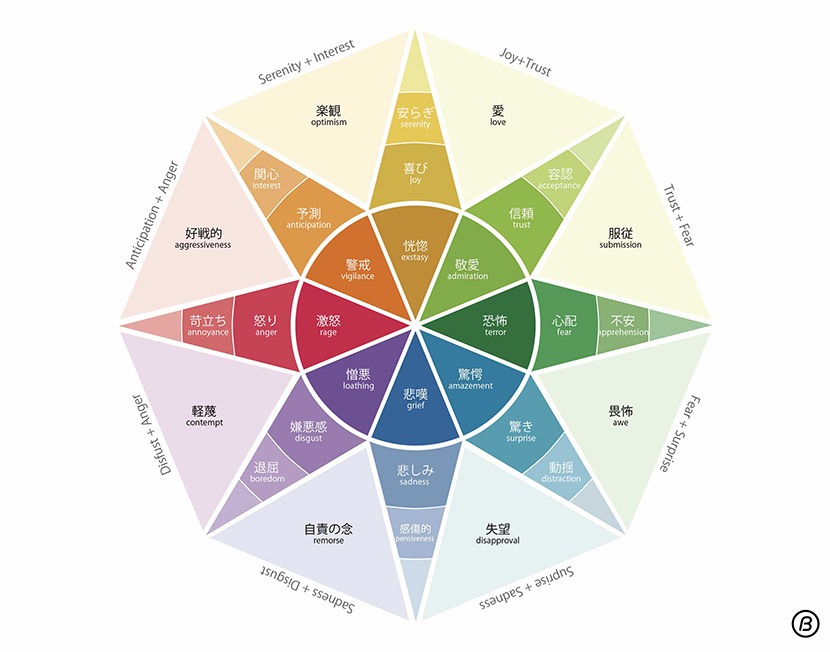 単にネガティブ、ポジティブと言ってもさまざまな種類がある。そこで感情に関する研究を行なっている Robert Plutchik は人の感情の主な種類を基礎感情として8つに分類した。