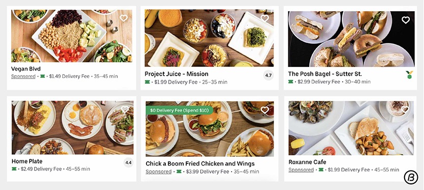 こういったアプリのサムネイル画像は見る人の注意を引くために、過度な装飾やユーザーを煽る文言を載せてるものをよく目にするが、Uber Eatsにはそういったストレスを感じる画像はほぼない。