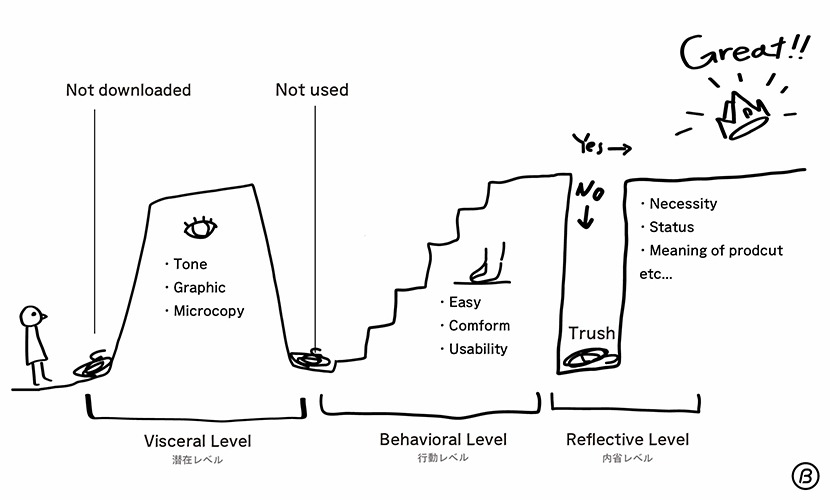ちなみに「誰のためのデザイン?」の作者であり、”ユーザー中心設計(User-centered design)”の提唱者である Don Norman は、人々がプロダクトの良し悪しを判断するときは3つのステップがあると述べている。