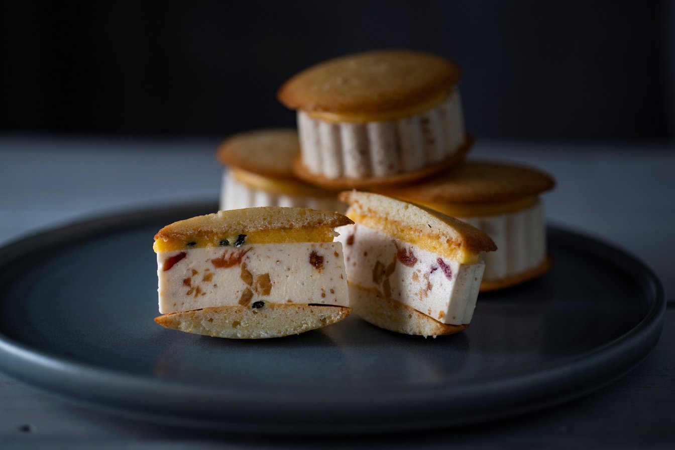 トロピカルな香りのパッションフルーツバター×たっぷりのフロマージュブランを、発酵バターとラムがきいたラングドシャでサンド。