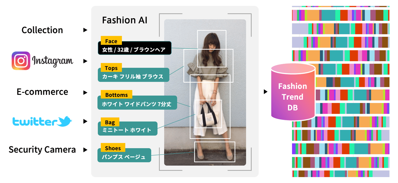 「#CBK forecast」は、ファッションコレクション、Instagram、ECなどから収集した画像をAIで解析。カテゴリー・色・柄・シルエット・素材など約600種類のタグと顔認識による性別・年齢などの推定情報をかけ合わせ、1,000万点以上のアイテムを分類し、そのデータを蓄積してきました。