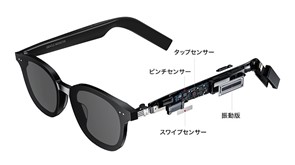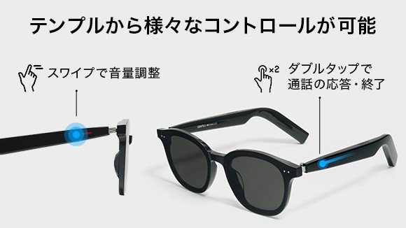 テンプルに指向性のセミオープンスピーカーとマイクを内蔵し、音楽の再生や通話ができる仕様。左右に計5つのタッチセンサーを備えており、柄の部分を指でなぞったりタップすることで、音量操作や曲の切り替え、通話の応答などもできます。